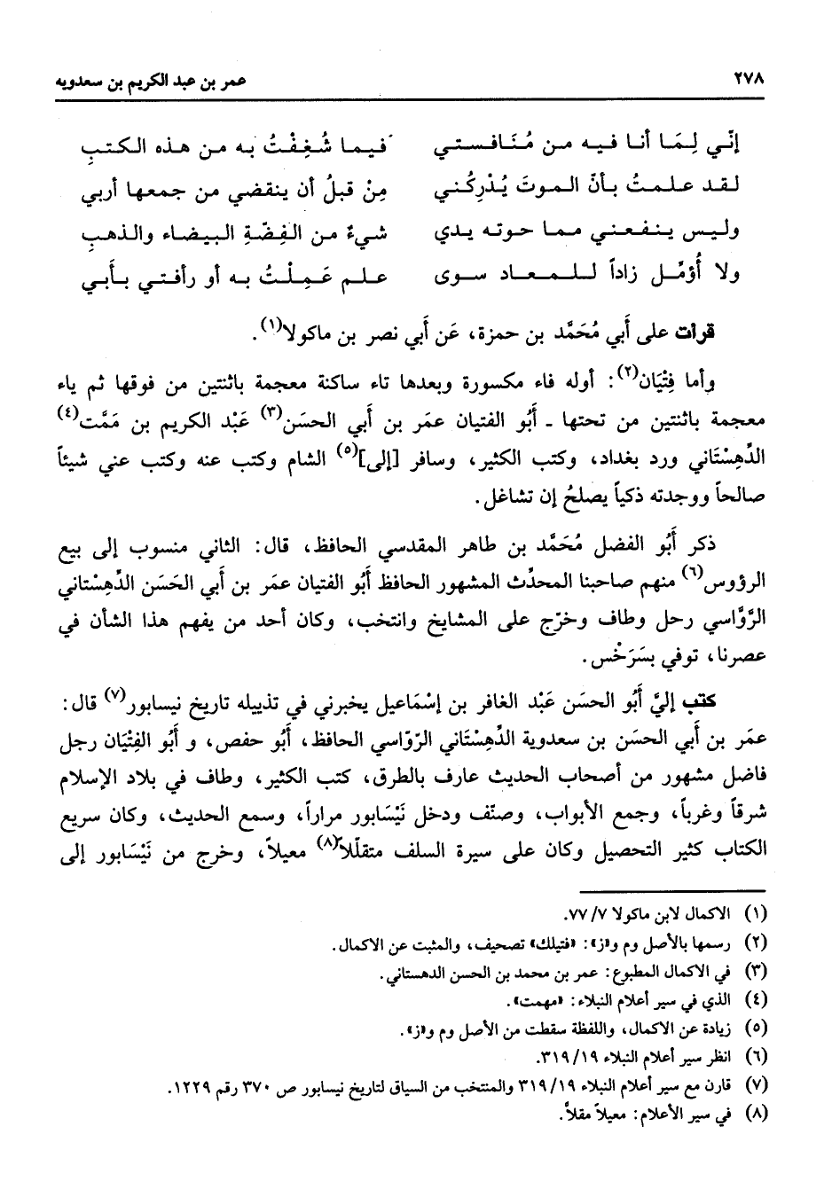 * إني لما أنا فيه من منافستي * فيما شغفت به من هذه الكتب لقد علمت بأن الموت يدركني من قبل أن ينقضي من جمعها أربي وليس ينفعني مما حوته يدي * شئ من الفضة البيضاء والذهب ولا أؤمل زادا للمعاد سوى * علم عملت به أو رأفتي بأبي * قرأت على أبي محمد بن حمزة عن أبي نصر بن ماكولا (1) وأما فتيان (2) أوله فاء مكسورة وبعدها تاء ساكنة معجمة باثنتين من فوقها ثم ياء معجمة باثنتين من تحتها أبا الفتيان عمر بن أبي الحسن (3) عبد الكريم بن ممت (4) الدهستاني ورد بغداد وكتب الكثير وسافر إلى (5) الشام وكتب عنه وكتب عني شيئا صالحا ووجدته ذكيا يصلح إن تشاغل ذكر أبو الفضل محمد بن طاهر المقدسي الحافظ قال الثاني منسوب إلى بيع الرؤوس (6) منهم صاحبنا المحدث المشهور الحافظ أبو الفتيان عمر بن أبي الحسن الدهستاني الرواسي رحل وطاف وخرج على المشايخ وانتخب وكان أحد من يفهم هذا الشأن في عصرنا توفي بسرخس كتب إلي أبو الحسن عبد الغافر بن إسماعيل يخبرني في تذييله تاريخ نيسابور (7) قال عمر بن أبي الحسن بن سعدوية الدهستاني الرواسي الحافظ أبو حفص وأبو الفتيان رجل فاضل مشهور من أصحاب الحديث عارف بالطرق كتب الكثير وطاف في بلاد الإسلام شرقا وغربا وجمع الأبواب وصنف ودخل نيسابور مرارا وسمع الحديث وكان سريع الكتاب كثير التحصيل وكان على سيرة السلف متقللا (8) معيلا وخرج من نيسابور إلى