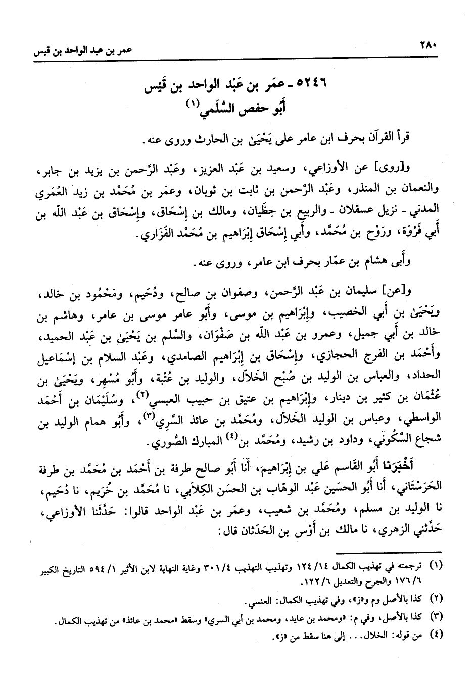 5246 - عمر بن عبد الواحد بن قيس أبو حفص السلمي (1) قرأ القرآن بحرف ابن عامر على يحيى بن الحارث وروى عنه وروى عن الأوزاعي وسعيد بن عبد العزيز وعبد الرحمن بن يزيد بن جابر والنعمان بن المنذر وعبد الرحمن بن ثابت بن ثوبان وعمر بن محمد بن زيد العمري المدني نزيل عسقلان والربيع بن حظيان ومالك بن إسحاق وإسحاق بن عبد الله بن أبي فروة وروح بن محمد وأبي إسحاق إبراهيم بن محمد الفزاري وأبي هشام بن عمار بحرف ابن عامر وروى عنه وعن سليمان بن عبد الرحمن وصفوان بن صالح ودحيم ومحمود بن خالد ويحيى بن أبي الخصيب وإبراهيم بن موسى وأبو عامر موسى بن عامر وهاشم بن خالد بن أبي جميل وعمرو بن عبد الله بن صفوان والسلم بن يحيى بن عبد الحميد وأحمد بن الفرج الحجازي وإسحاق بن إبراهيم الصامدي وعبد السلام بن إسماعيل الحداد والعباس بن الوليد بن صبح الخلال والوليد بن عتبة وأبو مسهر ويحيى بن عثمان بن كثير بن دينار وإبراهيم بن عتيق بن حبيب العبسي (2) وسليمان بن أحمد الواسطي وعباس بن الوليد الخلال ومحمد بن عائذ السري (3) وأبو همام الوليد بن شجاع السكوني وداود بن رشيد ومحمد بن (4) المبارك الصوري أخبرنا أبو القاسم علي بن إبراهيم أنا أبو صالح طرفة بن أحمد بن محمد بن طرفة الحرستاني أنا أبو الحسن عبد الوهاب بن الحسين الكلابي نا محمد بن خريم نا دحيم نا الوليد بن مسلم ومحمد بن شعيب وعمر بن عبد الواحد قالوا حدثنا الأوزاعي حدثني الزهري نا مالك بن أوس بن الحدثان قال