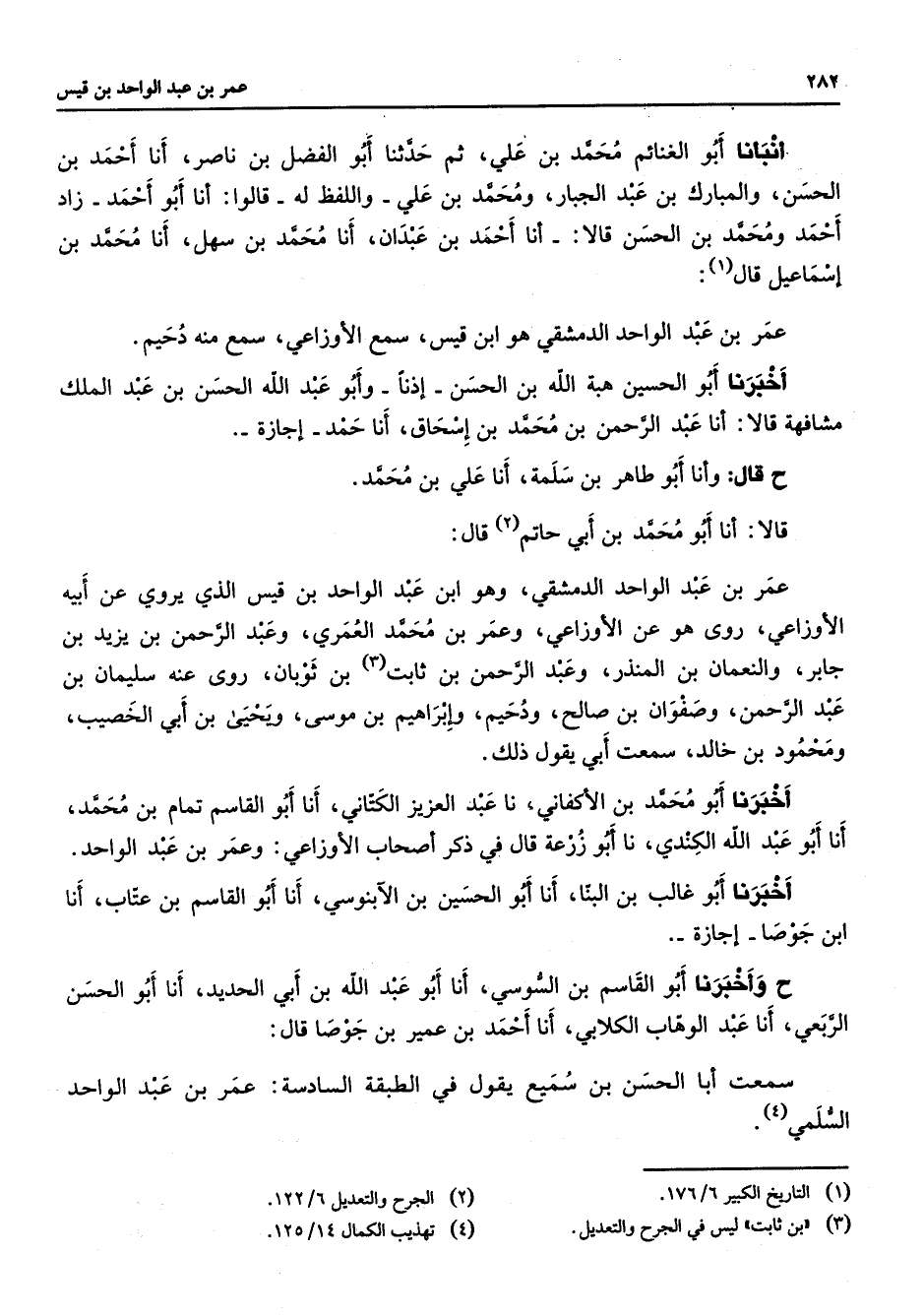 أنبأنا أبو الغنائم محمد بن علي ثم حدثنا أبو الفضل بن ناصر أنا أحمد بن الحسن والمبارك بن عبد الجبار ومحمد بن علي واللفظ له قالوا أنا أبو أحمد زاد أحمد ومحمد بن الحسن قالا أنا أحمد بن عبدان أنا محمد بن سهل أنا محمد بن إسماعيل قال (1) عمر بن عبد الواحد الدمشقي هو ابن قيس سمع الأوزاعي سمع منه دحيم أخبرنا أبو الحسين هبة الله بن الحسن إذنا وأبو عبد الله الحسن بن عبد الملك مشافهة قالا أنا عبد الرحمن بن محمد بن إسحاق أنا حمد إجازة ح قال وأنا أبو طاهر بن سلمة أنا علي بن محمد قالا أنا أبو محمد بن أبي حاتم (2) قال عمر بن عبد الواحد الدمشقي وهو ابن عبد الواحد بن قيس الذي يروي عن أبيه الأوزاعي روى هو عن الأوزاعي وعمر بن محمد العمري وعبد الرحمن بن يزيد بن جابر والنعمان بن المنذر وعبد الرحمن بن ثابت (3) بن ثوبان روى عنه سليمان بن عبد الرحمن وصفوان بن صالح ودحيم وإبراهيم بن موسى ويحيى بن أبي الخصيب ومحمود بن خالد سمعت أبي يقول ذلك أخبرنا أبو محمد بن الأكفاني نا عبد العزيز الكتاني أنا أبو القاسم تمام بن محمد أنا أبو عبد الله الكندي نا أبو زرعة قال في ذكر أصحاب الأوزاعي وعمر بن عبد الواحد أخبرنا أبو غالب بن البنا أنا أبو الحسين بن الآبنوسي أنا أبو القاسم بن عتاب أنا ابن جوصا إجازة ح وأخبرنا أبو القاسم بن السوسي أنا أبو عبد الله بن أبي الحديد أنا أبو الحسن الربعي أنا عبد الوهاب الكلابي أنا أحمد بن عمير بن جوصا قال سمعت أبا الحسن بن سميع يقول في الطبقة السادسة عمر بن عبد الواحد السلمي (4)