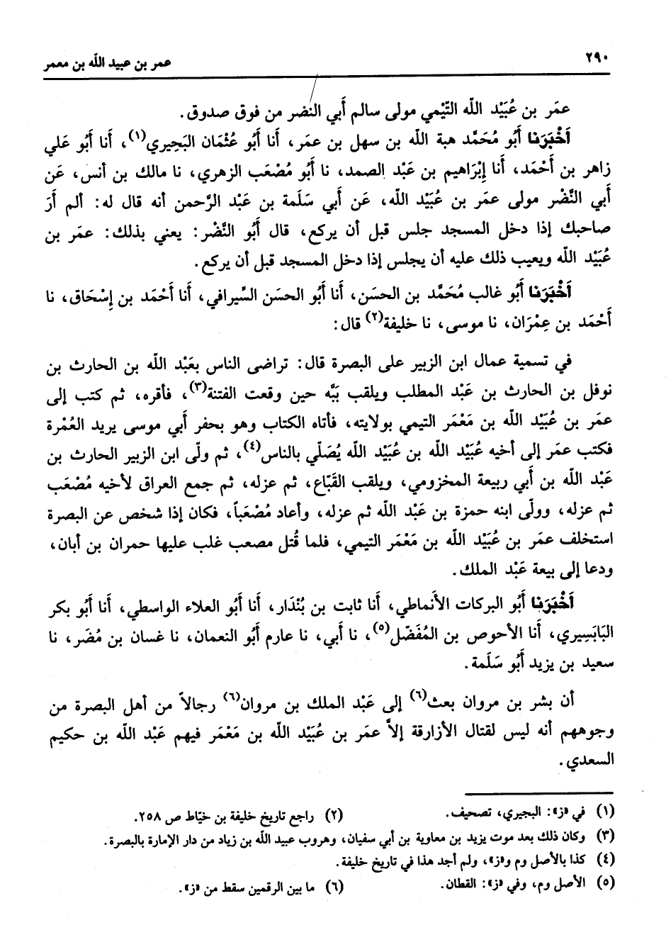 عمر بن عبيد الله التيمي مولى سالم أبي النضر من فوق صدوق أخبرنا أبو محمد هبة الله بن سهل بن عمر أنا أبو عثمان البحيري (1) أنا أبو علي زاهر بن أحمد أنا إبراهيم بن عبد الصمد نا أبو مصعب الزهري نا مالك بن أنس عن أبي النضر مولى عمر بن عبيد الله عن أبي سلمة بن عبد الرحمن أنه قال له ألم أرى صاحبك إذا دخل المسجد جلس قبل أن يركع قال أبو النضر يعني بذلك عمر بن عبيد الله ويعيب ذلك عليه أن يجلس إذا دخل المسجد قبل أن يركع أخبرنا أبن غالب محمد بن الحسن أنا أبو الحسن السيرافي أنا أحمد بن إسحاق نا أحمد بن عمرانا موسى نا خليفة (2) قال في تسمية عمال ابن الزبير على البصرة قال تراضى الناس بعبد الله بن الحارث بن نوفل بن الحارث بن عبد المطلب ويلقب ببه حين وقعت الفتنة (3) فأقره ثم كتب إلى عمر بن عبيد الله بن معمر التيمي بولايته فأتاه الكتاب وهو بحفر أبي موسى يريد العمرة فكتب عمر إلى أخيه عبيد الله بن عبيد الله يصلي بالناس (4) ثم ولى ابن الزبير الحارث بن عبد الله بن أبي ربيعة المخزومي ويلقب القباع ثم عزله ثم جمع العراق لأخيه مصعب ثم عزله وولى ابنه حمزة بن عبد الله ثم عزله وأعاد مصعبا فكان إذا شخص عن البصرة استخلف عمر بن عبيد الله بن معمر التيمي فلما قتل مصعب غلب عليها حمران بن أبان ودعا إلى بيعة عبد الملك أخبرنا أبو البركات الأنماطي أنا ثابت بن بندار أنا أبو العلاء الواسطي أنا أبو بكر البابسيري أنا الأحوص بن المفضل (5) نا أبي نا عارم أبو النعمان نا غسان بن مضرنا سعيد بن يزيد أبو سلمة أن بشر بن مروان بعث (6) إلى عبد الملك بن مروان (6) رجا من أهل البصرة من وجوههم أنه ليس لقتال الأزارقة إلا عمر بن عبيد الله بن معمر فيهم عبد الله بن حكيم السعدي