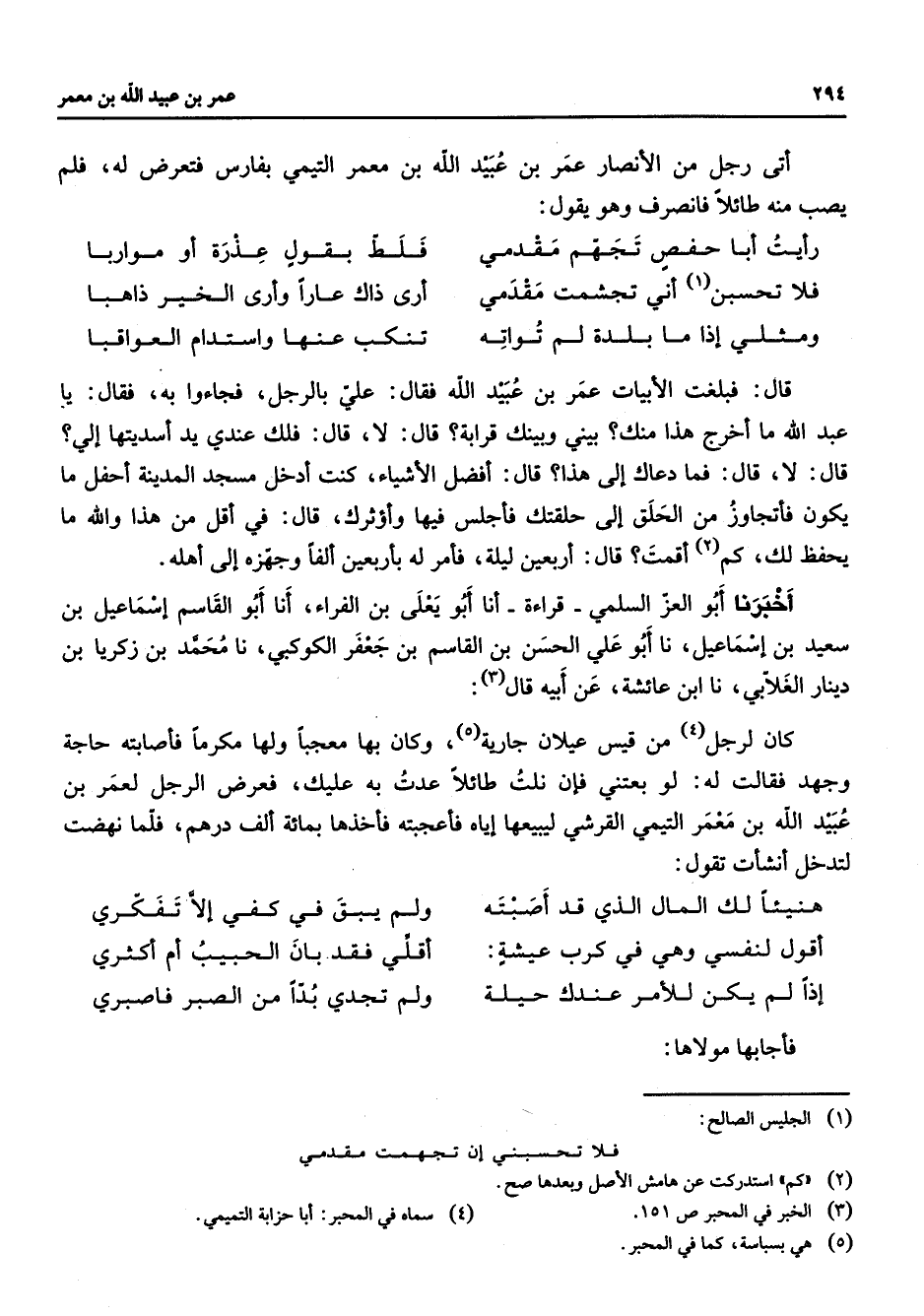أتى رجل من الأنصار عمر بن عبيد الله بن معمر التيمي بفارس فتعرض له فلم يصب منه طائلا فانصرف وهو يقول * رأيت أبا حفص تجهم مقدمي * فلط بقول عذرة أو مواربا فلا تحسبن (1) أني تجشمت مقدمي * أرى ذاك عارا وأر الخير ذاهبا ومثلي إذا ما بلدة لم تواته * تنكب عنها واستدام العواقبا * قال فبلغت الأبيات عمر بن عبيد الله فقال علي بالرجل فجاءوا به فقال يا عبد الله ما أخرج هذا منك بيني وبينك قرابة قال لا قال فلك عندي يد أسديتها إلي قال لا قال فما دعاك إلى هذا قال أفضل الأشياء كنت أدخل مسجد المدينة أحفل ما يكون فأتجاوز من الحلق إلى حلقتك فأجلس فيها وأؤثرك قال في أقل من هذا والله ما يحفظ لك كم (2) أقمت قال أربعين ليلة فأمر له بأربعين ألفا وجهزه إلى أهله أخبرنا أبو العز السلمي قراءة أنا أبو يعلى بن الفراء أنا أبو القاسم إسماعيل بن سعيد بن إسماعيل نا أبو علي الحسن بن القاسم بن جعفر الكوكبي نا محمد بن زكريا بن دينار الغلابي نا ابن عائشة عن أبيه قال (3) كان لرجل (4) من قيس عيلان جارية (5) وكان بها معجبا ولها مكرما فأصابته حاجة وجهد فقالت له لو بعتني فإن نلت طائلا عدت به عليك فعرض الرجل لعمر بن عبيد الله بن معمر التيمي القرشي ليبيعها إياه فأعجبته فأخذها بمائة ألف درهم فلما نهضت لتدخل انشأت تقول * هنيئا لك المال الذي قد أصبته * ولم يبق في كفي إلا تفكري أقول لنفسي وهي في كرب عيشة * أقلي فقد بان الحبيب أم أكثري إذا لم يكن للأمر عندك حيلة * ولم تجدي بدا من الصبر فاصبري * فأجابها مولاها