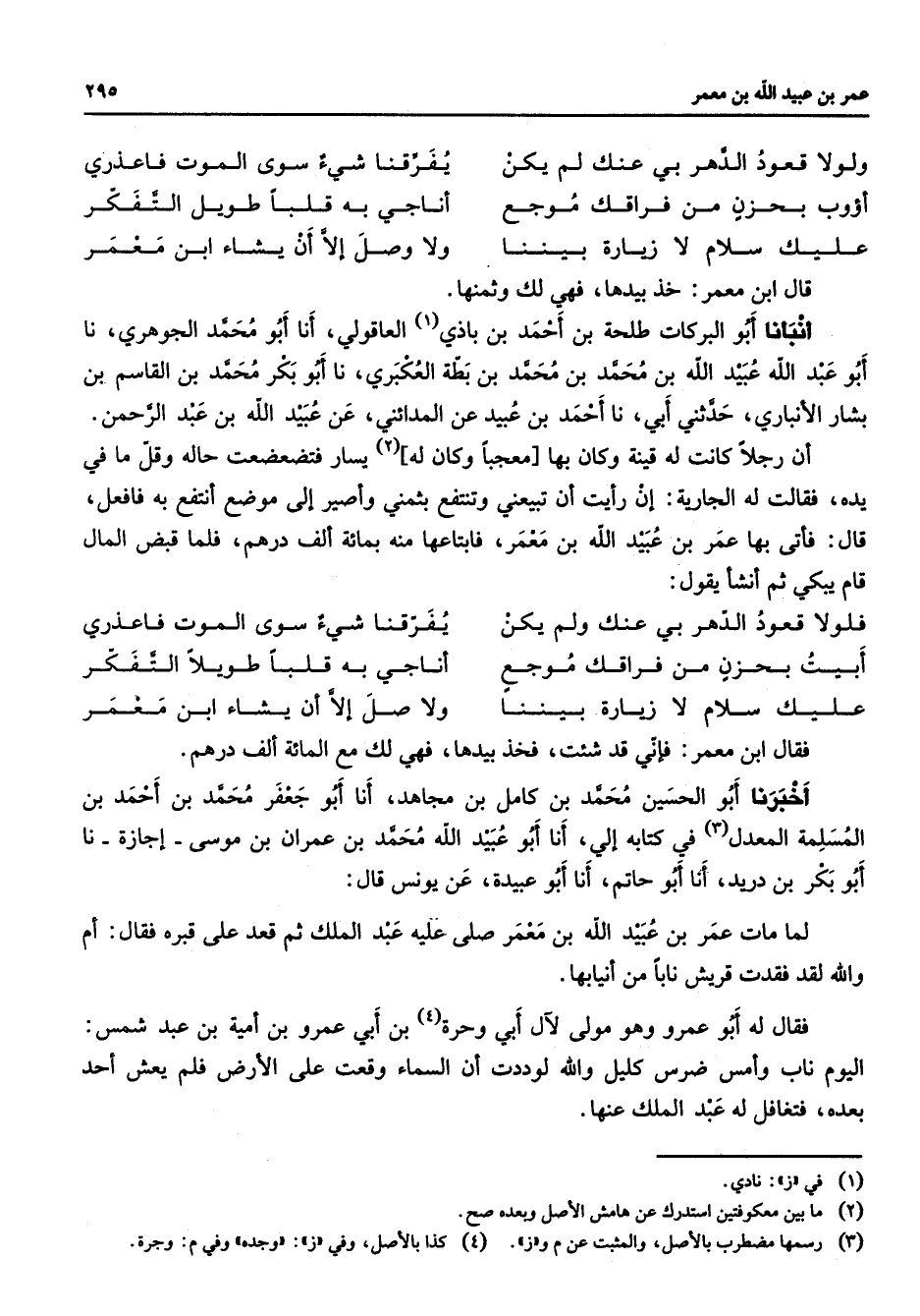 * ولولا قعود الدهر بي عنك لم يكن * يفرقنا شئ سوى الموت فاعذري * * أؤوب بحزن من فراقك موجع * أناجي به قلبا طويل التفكر عليك سلام لا زيارة بيننا * ولا وصل إلا أن يشاء ابن معمر * قال ابن معمر خبيدها فهي لك وثمنها أنبأنا أبو البركات طلحة بن أحمد بن باذي (1) العاقولي أنا أبو محمد الجوهري نا أبو عبد الله عبيد الله بن محمد بن محمد بن بطة العكبري نا أبو بكر محمد بن القاسم بن بشار الأنباري حدثني أبي نا أحمد بن عبيد عن المدائني عن عبيد الله بن عبد الرحمن أن رجلا كانت له قينة وكان بها معجبا وكان له (2) يسارف تضعضعت حاله وقل ما في يده فقالت له الجارية إن رأيت أن تبيعني وتنتفع بثمني وأصير إلى موضع أنتفع به فافعل قال فأتى بها عمر بن عبيد الله بن معمر فابتاعها منه بمائة ألف درهم فلما قبض المال قام يبكي ثم أنشأ يقول * فلولا قعود الدهر بي عنك ولم يكن * يفرقنا شئ سوى الموت فاعذري أبيت بحزن من فراقك موجع * أناجي به قلبا طويلا التفكر عليك سلام لا زيارة بيننا * ولا صل إلا أن يشاء ابن معمر * فقال ابن معمر فإني قد شئت فخذ بيدها فهي لك مع المائة ألف درهم أخبرنا أبو الحسين محمد بن كامل بن مجاهد أنا أبو جعفر محمد بن أحمد بن المسلمة المعدل (3) في كتابه إلي أنا أبو عبيد الله محمد بن عمران بن موسى إجازة نا أبو بكر بن دريد أنا أبو حاتم أنا أبو عبيدة عن يونس قال لما مات عمر بن عبيد الله بن معمر صلى عليه عبد الملك ثم قعد على قبره فقال أم والله لقد فقدت قريش نابا من أنيابها فقال له أبو عمرو وهو مولى لآل أبي وحرة (4) بن أبي عمرو بن أمية بن عبد شمس اليوم ناب وأمس ضرس كليل والله لوددت أن السماء وقعت على الأرض فلم يعش أحد بعده فتغافل له عبد الملك عنها