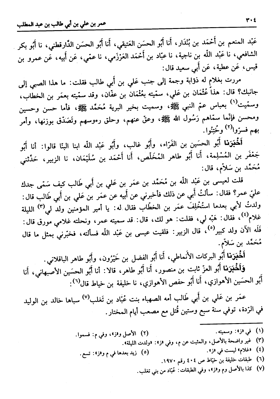 عبد المنعم بن أحمد بن بندار أنا أبو الحسن العتيقي أنا أبو الحسن الدارقطني نا أبو بكر الشافعي نا عبد الله بن ناجية نا عباد بن أحمد العرزمي نا عمي عن أبيه عن عمرو بن قيس عن عطية عن أبي سعيد قال مررت بغلام له ذؤابة وجمة إلى جنب علي بن أبي طالب فقلت ما هذا الصبي إلى جانبك قال هذا عثمان بن علي سميته بعثمان بن عفان وقد سميته بعمر بن الخطاب وسميت (1) بعباس عم النبي (صلى الله عليه وسلم) وسميت بخير البرية محمد (صلى الله عليه وسلم) فأما حسن وحسين ومحسن فإنما سماهم رسول الله (صلى الله عليه وسلم) وعق عنهم وحلق رؤوسهم وتصدق بوزنها وأمر بهم فسروا (2) وختنوا أخبرنا أبو الحسين بن الفراء وأبو غالب وأبو عبد الله ابنا البنا قالوا أنا أبو جعفر بن المسلمة أنا أبو طاهر المخلص أنا أحمد بن سليمان نا الزبير حدثني محمد بن سلام قال قلت لعيسى بن عبد الله بن محمد بن عمر بن علي بن أبي طالب كيف سمى جدك علي عمر فقال سألت أبي عن ذلك فأخبرني عن أبيه عن عمر بن علي بن أبي طالب قال ولدت لأبي بعدما استخلف عمر بن الخطاب فقال له يا أمير المؤمنين ولد لي الليلة غلام (4) فقال هبه لي فقلت هو لك قال قد سميته عمر ونحلته غلامي مورق قال فله الآن ولد كبير (5) قال الزبير فلقيت عيسى بن عبد الله فسألته فخبرني بمثل ما قال محمد بن سلام أخبرنا أبو البركات الأنماطي أنا أبو الفضل بن خيرون وأبو طاهر الباقلاني وأخبرنا أبو العز ثابت بن منصور أنا أبو طاهر قالا أنا أبو الحسين الأصبهاني أنا أبو الحسين الأهوازي أنا أبو حفص الأهوازي نا خليفة بن خياط قال (6) عمر بن علي بن أبي طالب أمه الصهباء بنت عباد بن تغلب (7) سباها خالد بن الوليد في الردة توفي سنة سبع وستين قتل مع مصعب أيام المختار
