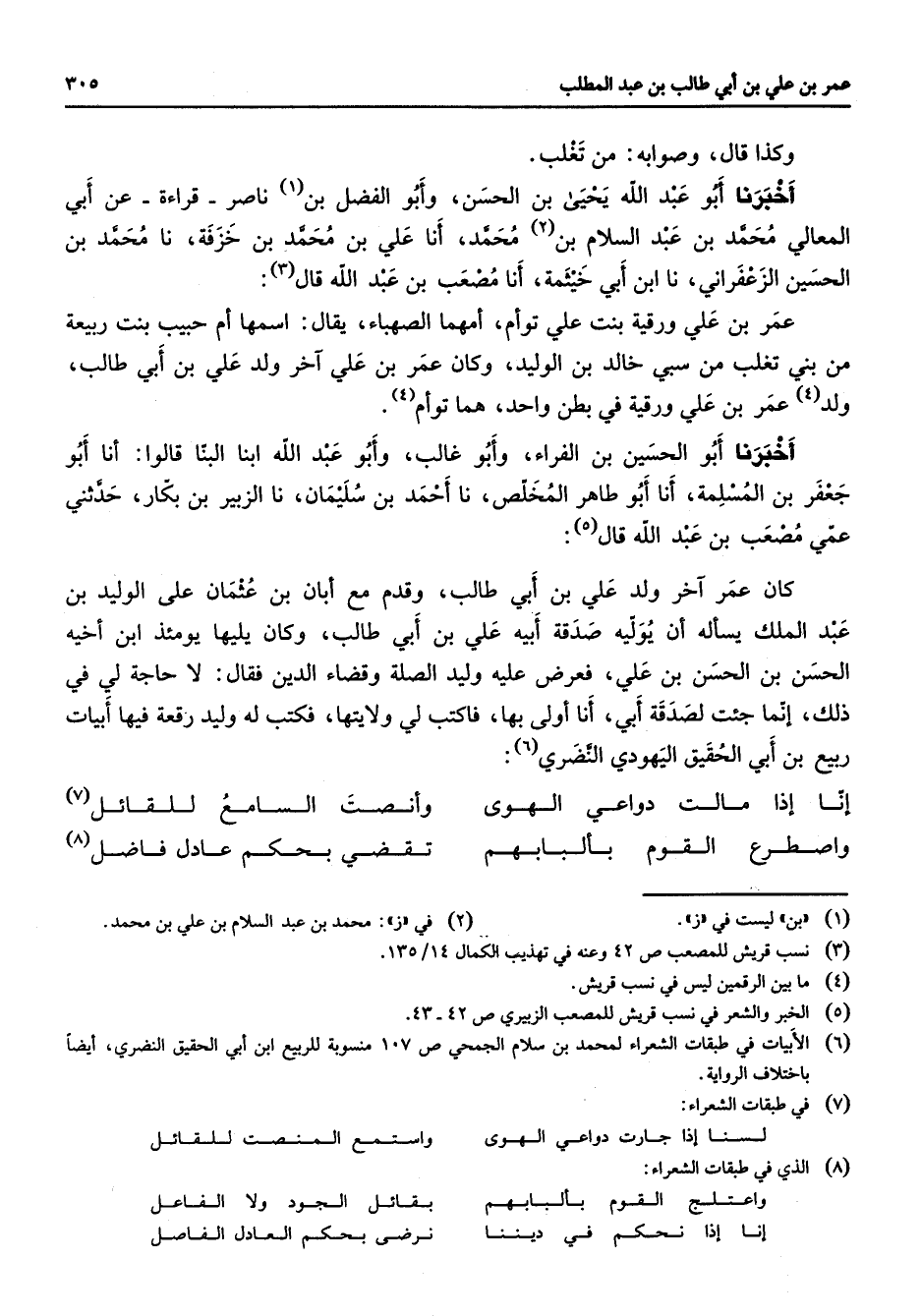 وكذا قال وصوابه من تغلب أخبرنا أبو عبد الله يحيى بن الحسن وأبو الفضل بن (1) ناصر قراءة عن أبي المعالي محمد بن عبد السلام بن (2) محمد أنا علي بن محمد بن خزفة نا محمد بن الحسين الزعفراني نا ابن أبي خيثمة أنا مصعب بن عبد الله قال (3) عمر بن علي ورقية بنت علي توأم أمهما الصهباء يقال اسمها أم حبيب بنت ربيعة من بني تغلب من سبي خالد بن الوليد وكان عمر بن علي آخر ولد علي بن أبي طالب ولد (4) عمر بن علي ورقيفي بطن واحد هما توأم (4) أخبرنا أبو الحسين بن الفراء وأبو غالب وأبو عبد الله ابنا البنا قالوا أنا أبو جعفر بن المسلمة أنا أبو طاهر المخلص نا أحمد بن سليمان نا الزبير بن بكار حدثني عمي مصعب بن عبد الله قال (5) كان عمر آخر ولد علي بن أبي طالب وقدم مع أبان بن عثمان على الوليد بن عبد الملك يسأله أيوليه صدقة أبيه علي بن أبي طالب وكان يليها يومئذ ابن أخيه الحسن بن الحسن بن علي فعرض عليه وليد الصلة وقضاء الدين فقال لا حاجة لي في ذلك إنما جئت لصدقة أبي أنا أولى بها فاكتب لي ولايتها فكتب له وليد رقعة فيها أبيات ربيع بن أبي الحقيق اليهودي النضري (6) * إنا إذا مالت دواعي الهوى * وأنصت السامع للقائل (7) واصطرع القوم بألبابهم * تقضي بحكم عادل فاضل (8)