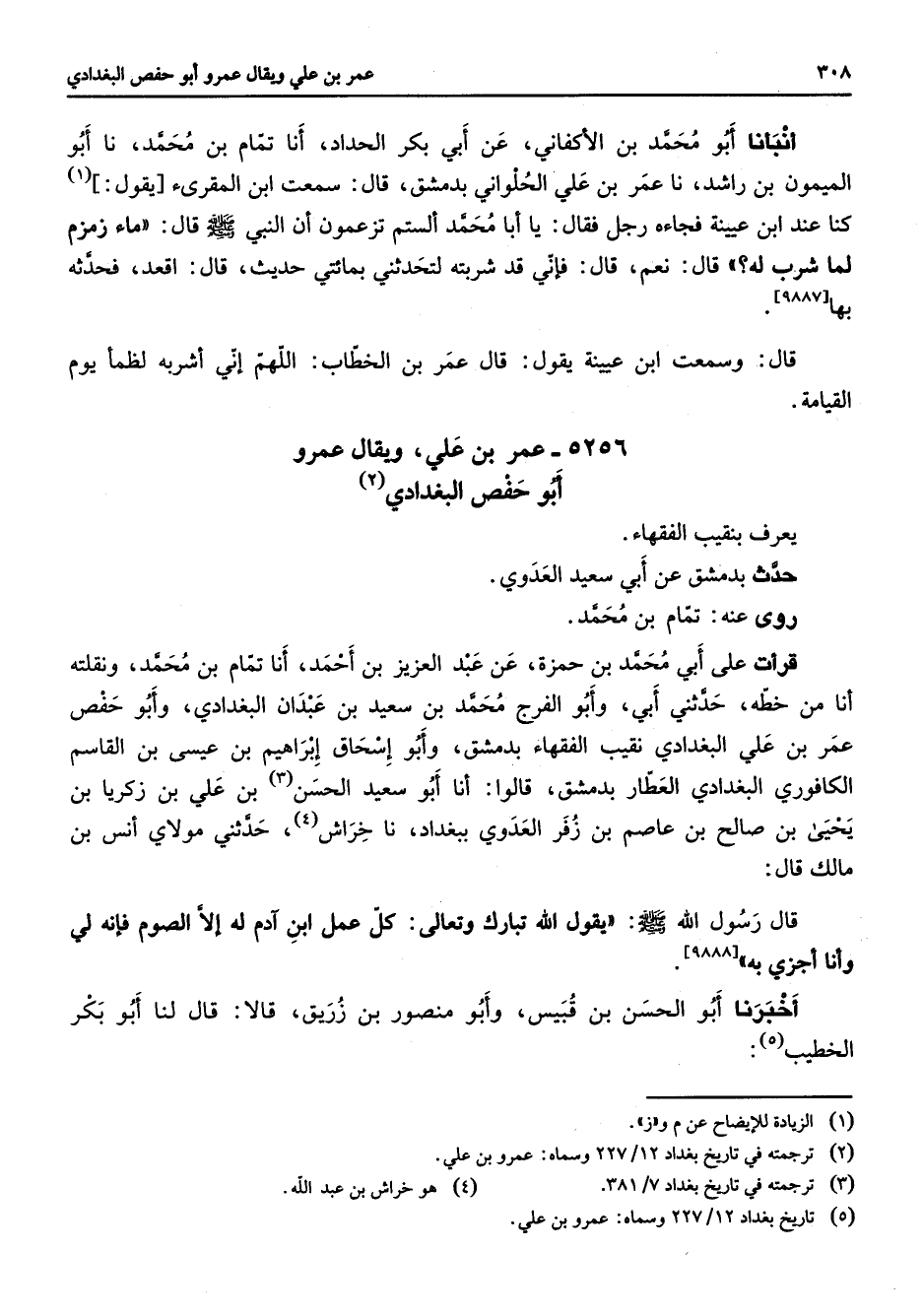 5256 - عمر بن علي ويقال عمرو أبو حفص البغدادي (2) يعرف بنقيب الفقهاء حدث بدمشق عن أبي سعيد العدوي روى عنه تمام بن محمد قرأت على أبي محمد بن حمزة عن عبد العزيز بن أحمد أنا تمام بن محمد ونقلته أنا من خطه حدثني أبي وأبو الفرج محمد بن سعيد بن عبدان البغدادي وأبو حفص عمر بن علي البغدادي نقيب الفقهاء بدمشق وأبو إسحاق إبراهيم بن عيسى بن القاسم الكافوري البغدادي العطار بدمشق قالوا أنا أبو سعيد الحسن (3) بن علي بن زكريا بن يحيى بن الح بن عاصم بن زفر العدوي ببغداد نا خراش حدثني مولاي أنس بن مالك قال قال رسول الله (صلى الله عليه وسلم) يقول الله تبارك وتعالى كل عمل ابن آدم له الصوم فإنه لي وأنا أجزي به أخبرنا أبو الحسن بن قبيس وأبو منصور بن زريق قالا قال لنا أبو بكر الخطيب (5)