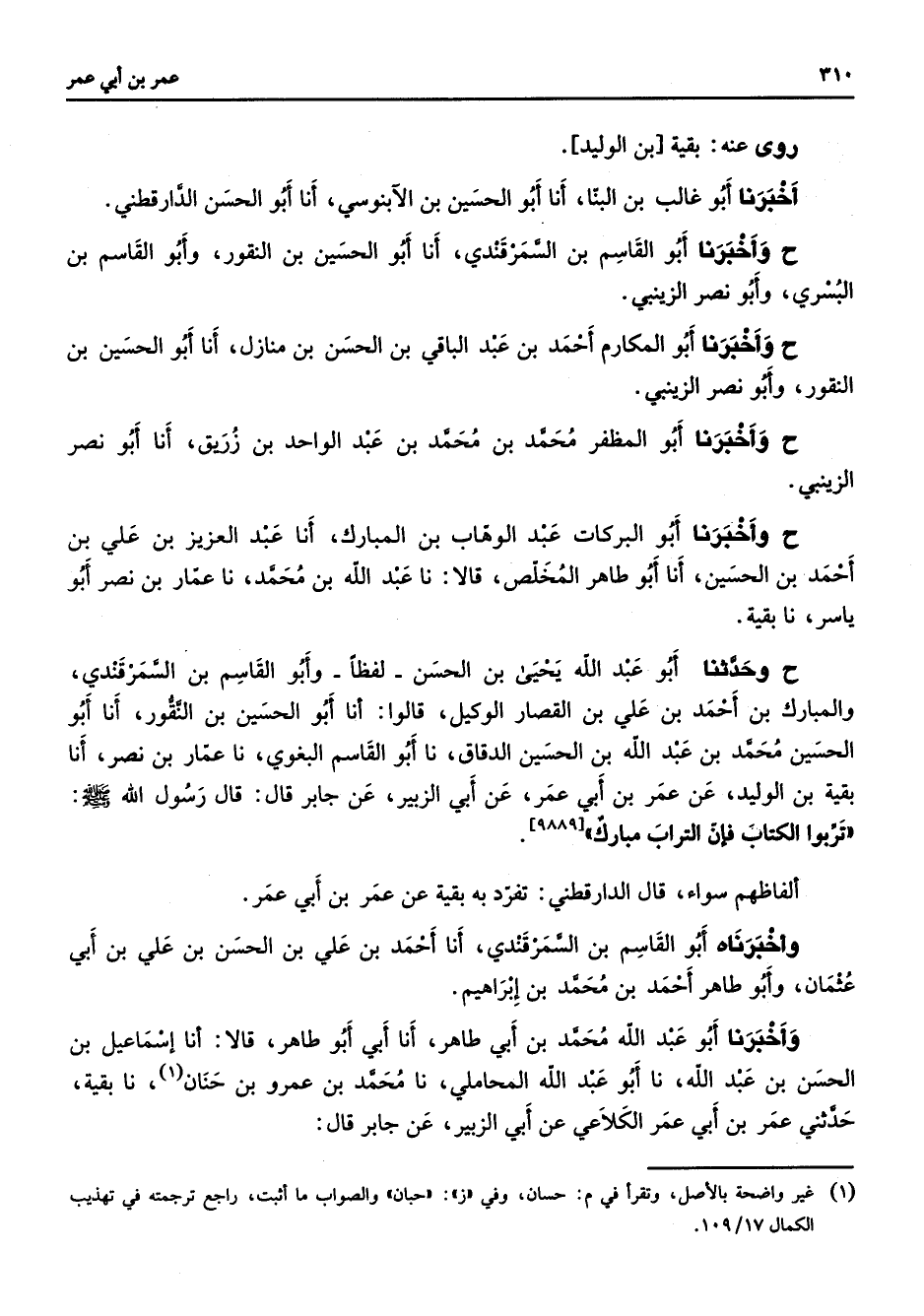 روى عنه بقية بن الوليد أخبرنا أبو غالب بن البنا أنا أبو الحسين بن الآبنوسي أنا أبو الحسن الدارقطني ح وأخبرنا أبو القاسم بن السمرقندي أنا أبو الحسين بن النقور وأبو القاسم بن البسري وأبو نصر الزينبي ح وأخبرنا أبو المكارم أحمد بن عبد الباقي بن الحسن بن منازل أنا أبو الحسين بن النقور وأبو نصر الزينبي ح وأخبرنا أبو المظفر محمد بن محمد بن عبد الواحد بن زريق أنا أبو نصر الزينبي ح وأخبرنا أبو البركات عبد الوهاب بن المبارك أنا عبد العزيز بن علي بن أحمد بن الحسين أنا أبو طاهر المخلص قالا نا عبد الله بن محمد نا عمار بن نصر أبو ياسر نا بقية ح وحدثنا أبو عبد الله يحيى بن الحسن لفظا وأبو القاسم بن السمرقندي والمبارك بن أحمد بن علي بن القصار الوكيل قالوا أنا أبو الحسين بن النقور أنا أبو الحسين محمد بن عبد الله بن الحسين الدقاق نا أبو القاسم البغوي نا عمار بن نصر أنا بقية بن الوليد عن عمر بن أبي عمر عن أبي الزبير عن جابر قال قال رسول الله (صلى الله عليه وسلم) تربوا الكتاب فإن التراب مبارك ألفاظهم سواء قال الدارقطني تفرد به بقية عن عمر بن أبي عمر وأخبرناه أبو القاسم بن السمرقندي أنا أحمد بن علي بن الحسن بن علي بن أبي عثمان وأبو طاهر أحمد بن محمد بن إبراهيم وأخبرنا أبو عبد الله محمد بن أبي طاهر أنا أبي أبو طاهر قالا أنا إسماعيل بن الحسن بن عبد الله نا أبو عبد الله المحاملي نا محمد بن عمرو بن حنان (1) نا بقية حدثني عمر بن أبي عمر الكلاعي عن أبي الزبير عن جابر قال