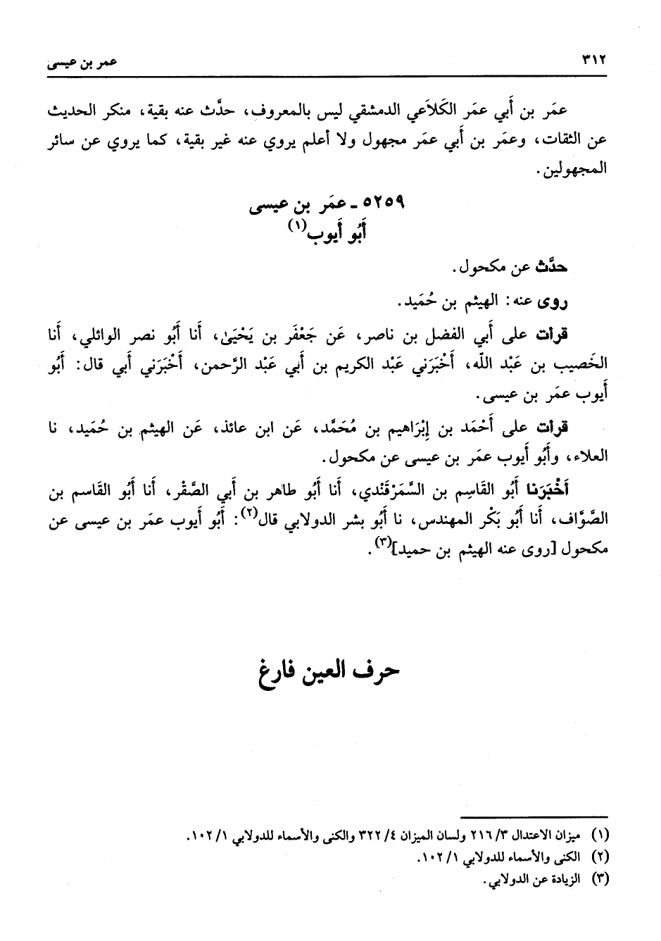 5259 - عمر بن عيسى أبو أيوب (1) حدث عن مكحول روى عنه الهيثم بن حميد قرأت على أبي الفضل بن ناصر عن جعفر بن يحيى أنا أبو نصر الوائلي أنا الخصيب بن عبد الله أخبرني عبد الكريم بن أبي عبد الرحمن أخبرني أبي قال أبو أيوب عمر بن عيسى قرأت على أحمد بن إبراهيم بن محمد عن ابن عائذ عن الهيثم بن حميدنا العلاء وأبو أيوب عمر بن عيسى عن مكحول أخبرنا أبو القاسم بن السمرقندي أنا أبو طاهر بن أبي الصقر أنا أبو القاسم بن الصواف أنا أبو بكر المهندس نا أبو بشر الدولابي قال (2) أبو أيوب عمر بن عيسى عن مكحول روى عنه الهيثم بن حميد (3) " حرف العين فارغ
