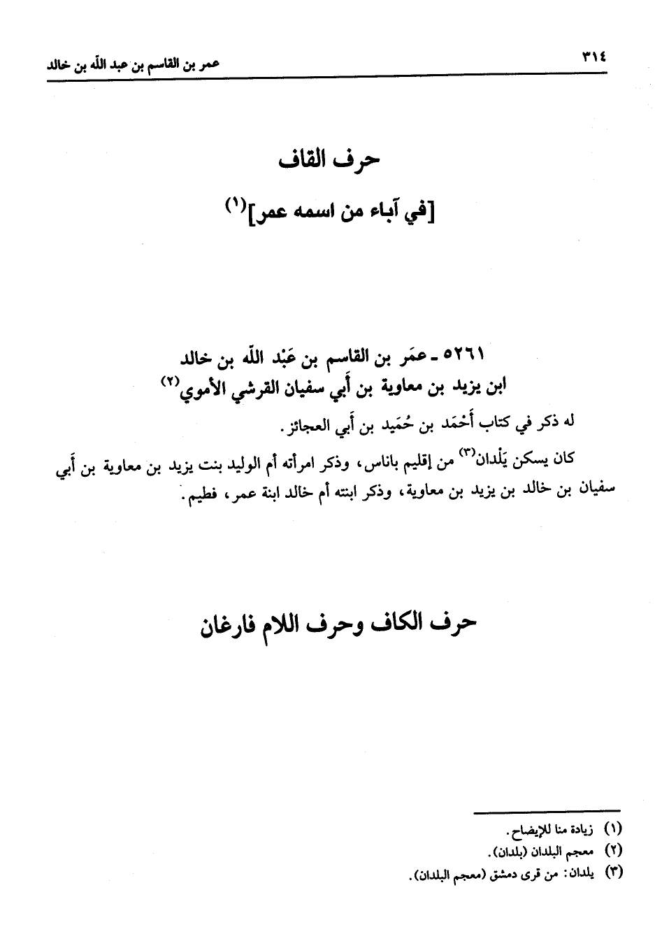 " حرف القاف " " في آباء من اسمه عمر " (1) 5261 عمر بن القاسم بن عبد الله بن خالد ابن يزيد بن معاوية بن أبي سفيان القرشي الأموي (2) له ذكر في كتاب أحمد بن حميد بن أبي العجائز كان يسكن يلدان (3) من إقليم باناس وذكر امرأته أم الوليد بنت يزيد بن معاوية بن أبي سفيان بن خالد بن يزيد بن معاوية وذكر ابنته أم خالد ابنة عمر فطيم " حرف الكاف وحرف اللام فارغان "
