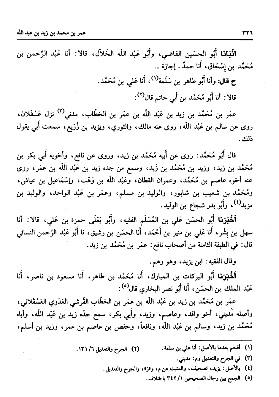 أنبأنا أبو الحسين القاضي وأبو عبد الله الخلال قالا أنا عبد الرحمن بن محمد بن إسحاق أنا حمد إجازة ح قال وأنا أبو طاهر بن سلمة (1) أنا علي بن محمد قالا أنا أبو محمد بن أبي حاتم قال (2) عمر بن محمد بن زيد بن عبد الله بن عمر بن الخطاب مدني (3) نزل عسقلان روى عن سالم بن عبد الله روى عنه مالك والثوري ويزيد بن زريع سمعت أبي يقول ذلك قال أبو محمد روى عن أبيه محمد بن زيد وروى عن نافع وأخويه أبي بكر بن محمد بن زيد وزيد بن محمد بن زيد وسمع من جده زيد بن عبد الله بن عمر روى عنه أخوه عاصم بن محمد وعمران القطان وعبد الله بن وهب وإسماعيل بن عياش ومحمد بن شعيب بن شابور والوليد بن مسلم وعمر بن عبد الواحد والوليد بن مزيد (4) وأبو بدر شجاع بن الوليد أخبرنا أبو الحسن علي بن المسلم الفقيه وأبو يعلى حمزة بن علي قالا أنا سهل بن بشر أنا علي بن منير بن أحمد أنا الحسن بن رشيق نا أبو عبد الرحمن النسائي قال في الطبقة الثامنة من أصحاب نافع عمر بن محمد بن زيد وقال الفقيه ابن يزيد وهو وهم أخبرنا أبو البركات بن المبارك أنا محمد بن طاهر أنا مسعود بن ناصر أنا عبد الملك بن الحسن أنا أبو نصر البخاري قال (5) عمر بن محمد بن زيد بن عبد الله بن عمر بن الخطاب القرشي العدوي العسقلاني وأصله مديني أخو واقد وعاصم وزيد وأبي بكر سمع جده زيد بن عبد الله وأباه محمد بن زيد وسالم بن عبد الله ونافعا وحفص بن عاصم بن عمر وزيد بن أسلم