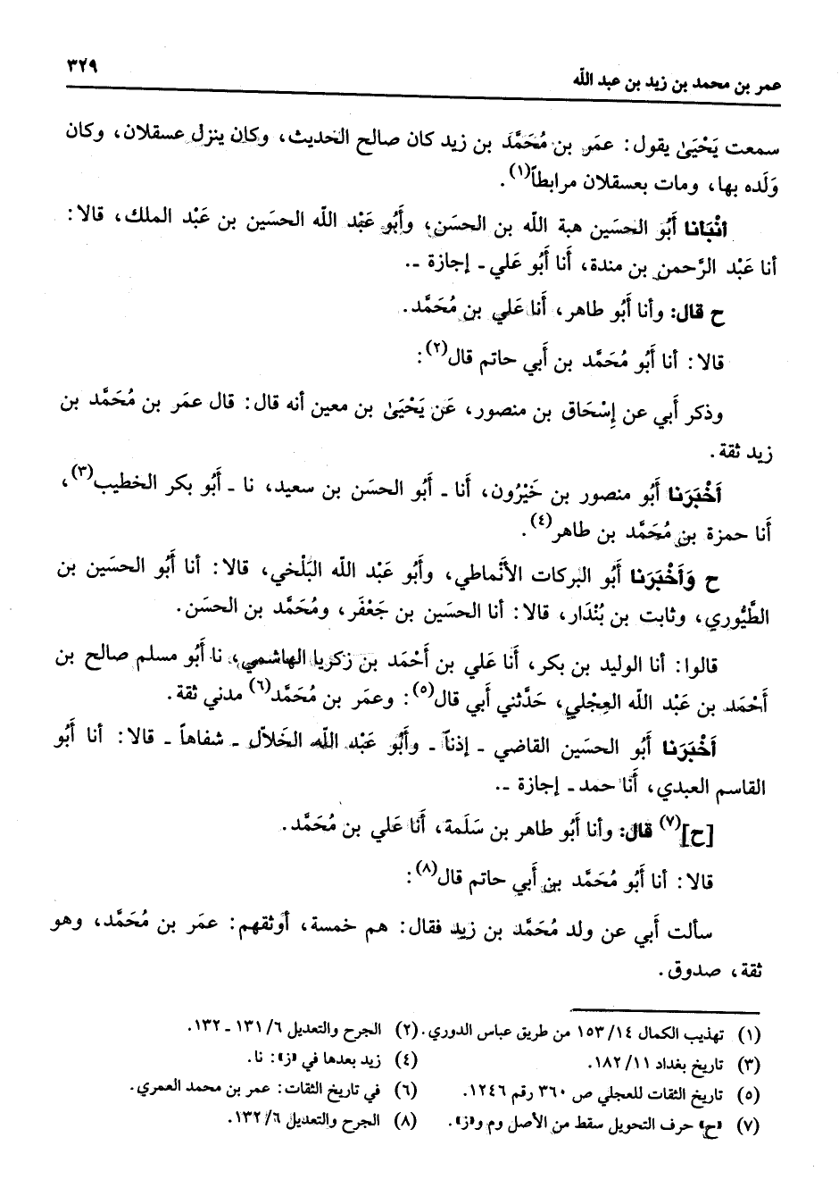 سمعت يحيى يقول عمر بن محمد بن زيد كان صالح الحديث وكان ينزل عسقلان وكان ولده بها ومات بعسقلان مرابطا (1) أنبأنا أبو الحسين هبة الله بن الحسن وأبو عبد الله الحسين بن عبد الملك قالا أنا عبد الرحمن بن مندة أنا أبو علي إجازة ح قال وأنا أبو طاهر أنا علي بن محمد قالا أنا أبو محمد بن أبي حاتم قال (2) وذكر أبي عن إسحاق بن منصور عن يحيى بن معين أنه قال قال عمر بن محمد بن زيد ثقة أخبرنا أبو منصور بن خيرون أنا أبو الحسن بن سعيد نا أبو بكر الخطيب (3) أنا حمزة بن محمد بن طاهر (4) ح وأخبرنا أبو البركات الأنماطي وأبو عبد الله البلخي قالا أنا أبو الحسين بن الطيوري وثابت بن بندار قالا أنا الحسين بن جعفر ومحمد بن الحسن
