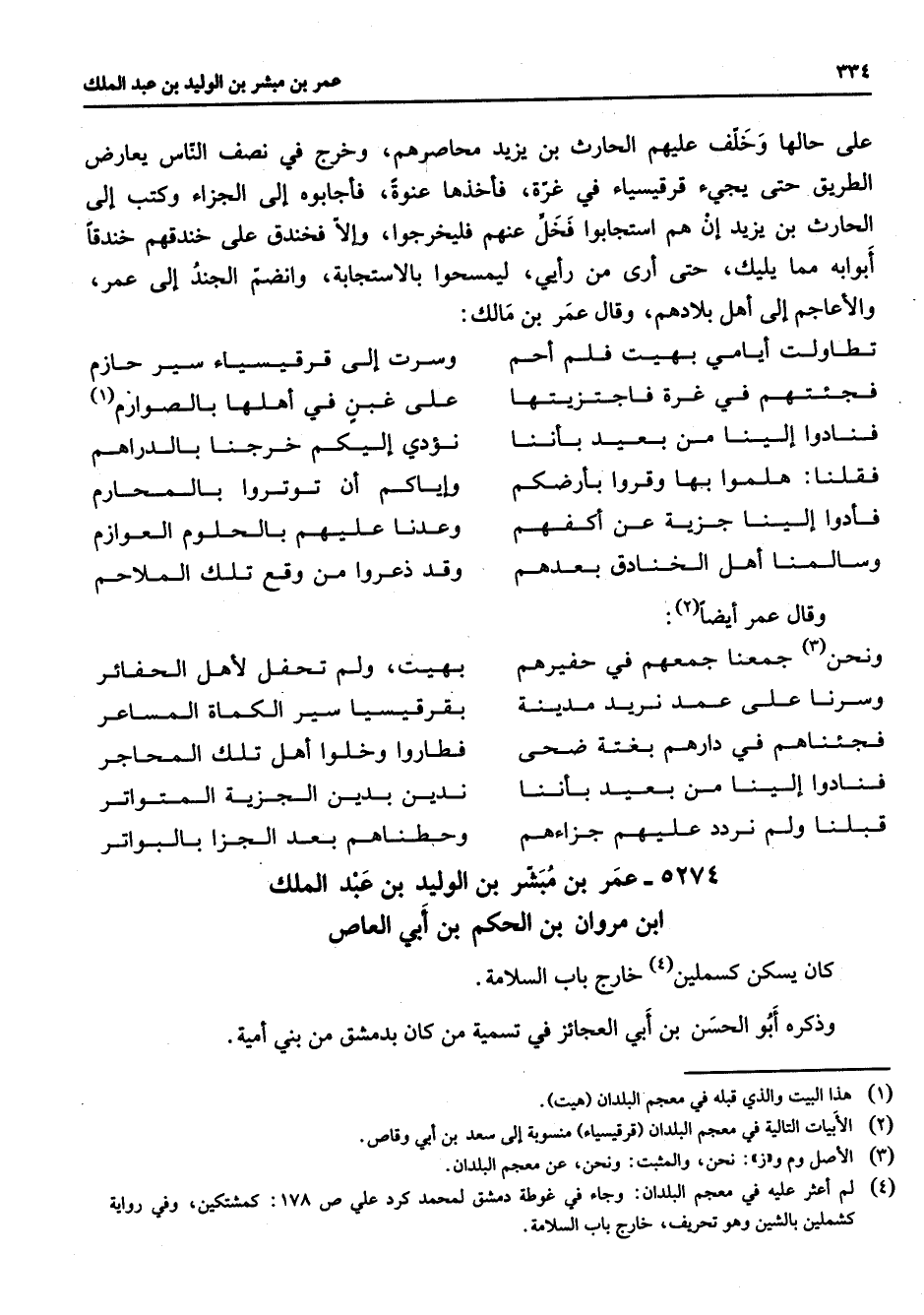5274 - عمر بن مبشر بن الوليد بن عبد الملك بن مروان بن الحكم بن أبي العاص كان يسكن كسملين (4) خارج باب السلامة وذكره أبو الحسن بن أبي العجائز في تسمية من كان بدمشق من بني أمية