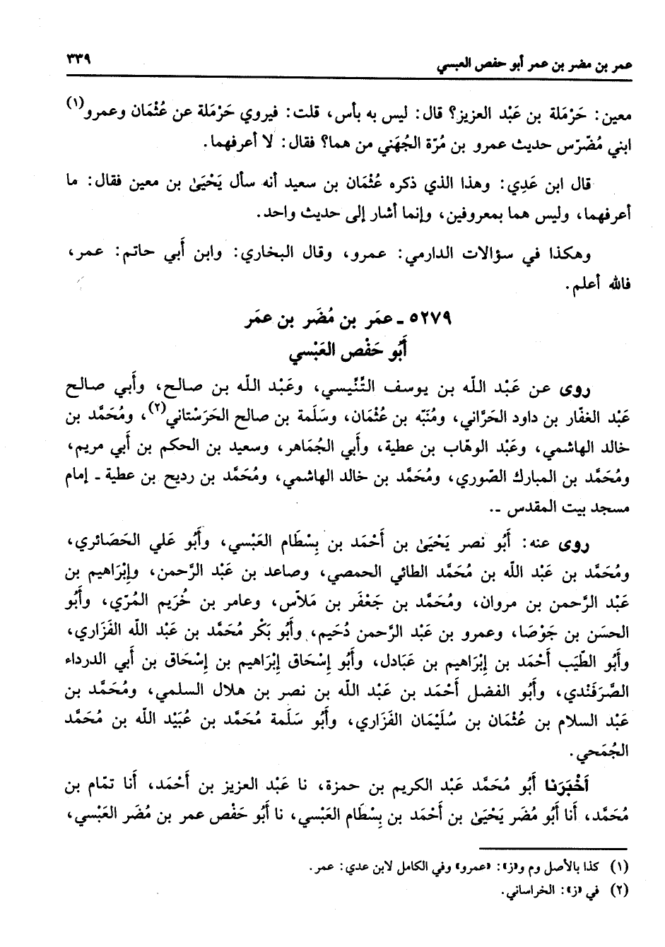 حرملة بن عبد العزيز قال ليس به بأس قلت فيروي حرملة عن عثمان وعمرو (1) ابني مضرس حديث عمرو بن مرة الجهني من هما فقال لا أعرفهما قال ابن عدي وهذا الذي ذكره عثمان بن سعيد أنه سأل يحيى بن معين فقال ما أعرفهما وليس هما بمعروفين وإنما أشار إلى حديث واحد وهكذا فسؤالات الدارمي عمرو وقال البخاري وابن أبي حاتم عمر فالله أعلم
