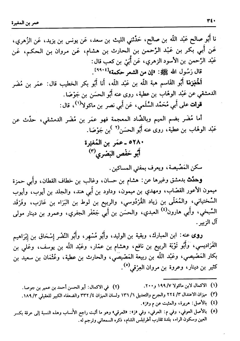 5280 - عمر بن المغيرة أبو حفص البصري (3) سكن المصيصة ويعرف بمفتي المساكين وحدث بدمشق وغيرها عن هشام بن حسان وغالب بن خطاف القطان وأبي حمزة ميمون الأعور القصاب ومهدي بن ميمون وداود بن أبي هند والجلد بن أيوب وأيوب السختياني والمعلى بن زياد القردوسي والربيع بن لوط بن البراء بن عازب وفرقد السبخي وأبي هارون (4) العبدي والحسن بن أبي جعفر الجفري وعمرو بن دينار مولى آل الزبير روى عنه ابن المبارك وبقية بن الوليد وأبو مسهر وأبو النضر إسحاق بن إبراهيم الفراديسي وأبو توبة الربيع بن نافع وهشام بن عمار وعبد الله بن يوسف وعلي بن بكار المصيصي وعبد الله بن ربيعة المصيصي والحارث بن عطية وعثمان بن سعيد بن كثير بن دينار وعروة بن مروان العرقي (5)
