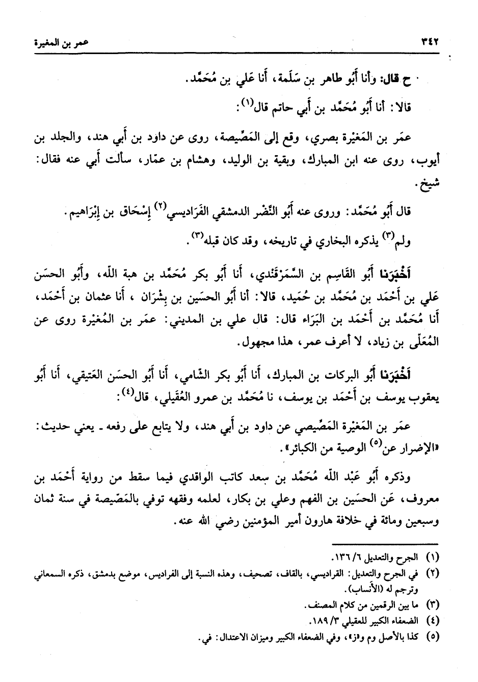 ح قال وأنا أبو طاهر بن سلمة أنا علي بن محمد قالا أنا أبو محمد بن أبي حاتم قال (1) عمر بن المغيرة بصري وقع إلى المصيصة روى عن داود بن أبي هند والجلد بن أيوب روى عنه ابن المبارك وبقية بن الوليد وهشام بن عمار سألت أبي عنه فقال شيخ قال أبو محمد وروى عنه أبو النضر الدمشقي الفراديسي (2) إسحاق بن إبراهيم ولم (3) يذكره بالبخاري في تاريخه وقد كان قبله (3) أخبرنا أبو القاسم بن السمرقندي أنا أبو بكر محمد بن هبة الله وأبو الحسن علي بن أحمد بن محمد بن حميد قالا أنا أبو الحسين بن بشران أنا عثمان بن أحمد أنا محمد بن أحمد بن البراء قال قال علي بن المديني عمر بن المغيرة روى عن المعلى بن زياد لا أعرف عمر هذا مجهول أخبرنا أبو البركات بن المبارك أنا أبو بكر الشامي أنا أبو الحسن العتيقي أنا أبو يعقوب يوسف بن أحمد بن يوسف نا محمد بن عمرو العقيلي قال (4) عمر بن المغيرة المصيصي عن داود بن أبي هند ولا يتابع على رفعه يعني حديث الإضرار عن (5) الوصية من الكبائر