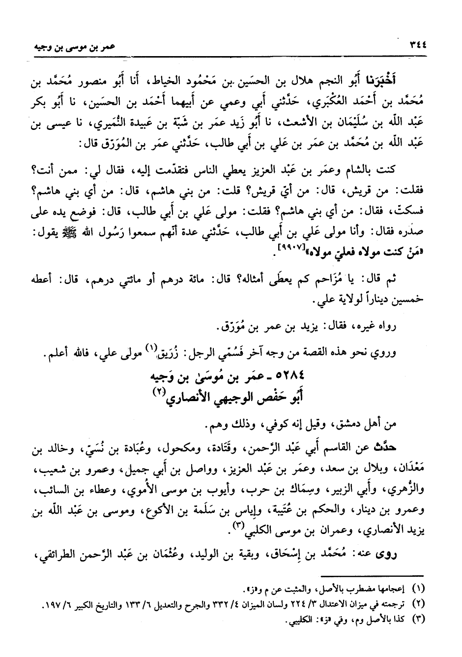 أخبرنا أبو النجم هلال بن الحسين بن محمود الخياط أنا أبو منصور محمد بن محمد بن أحمد العكبري حدثني أبي وعمي عن أبيهما أحمد بن الحسين نا أبو بكر عبد الله بن سليمان بن الأشعث نا أبو زيد عمر بن شبة بن عبيدة النميري نا عيسى بن عبد الله بن محمد بن عمر بن علي بن أبي طالب حدثني عمر بن المورق قال كنت بالشام وعمر بن عبد العزيز يعطي الناس فتقدمت إليه فقال لي ممن أنت فقلت من قريش قال منأي قريش قلت من بني هاشم قال من أي بني هاشم فسكت فقال من أي بن هاشم فقلت مولى علي بن أبي طالب قال فوضع يده على صدره فقال وأنا مولى علي بن أبي طالب حدثني عدة أنهم سمعوا رسول الله (صلى الله عليه وسلم) يقول من كنت مولاه فعلي مولاه ثم قال يا مزاحم كم يعطى أمثاله قال مائة درهم أو مائتي درهم قال أعطه خمسين دينار لولاية علي رواه غيره فقال يزيد بن عمر بن مورق وروي نحو هذه القصة من وجه آخر فسمي الرجل زريق (1) مولى علي فالله أعلم
