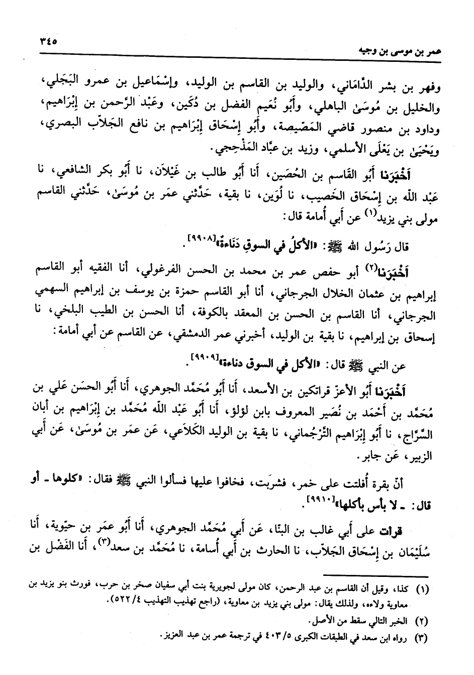 وفهر بن بشر الداماني والوليد بن القاسم بن الوليد وإسماعيل بن عمرو البجلي والخليل بن موسى الباهلي وأبو نعيم الفضل بن دكين وعبد الرحمن بن إبراهيم وداود بن منصور قاضي المصيصة وأبو إسحاق إبراهيم بن نافع الجلاب البصري ويحيى بن يعلى الأسلمي وزيد بن عباد المذحجي أخبرنا أبو القاسم بن الحصين أنا أبو طالب بن غيلان نا أبو بكر الشافعي نا عبد الله بن إسحاق الخصيب نا لوين نا بقية حدثني عمر بن موسى حدثني القاسم مولى بني يزيد (1) عن أبي أمامة قال قال رسول الله (صلى الله عليه وسلم) الأكل في السوق دناءة [* * *] أخبرنا (2) أبو حفص عمر بن محمد بن الحسن الفرغولي أنا الفقيه أبو القاسم إبراهيم بن عثمان الخلال الجرجاني أنا أبو القاسم حمزة بن يوسف بن إبراهيم السهمي الجرجاني أنا القاسم بن الحسن بن المعقد بالكوفة أنا الحسن بن الطيب البلخي نا إسحاق بن إبراهيم نا بقية بن الوليد أخبرني عمر الدمشقي عن القاسم عن أبي أمامة عن النبي (صلى الله عليه وسلم) قال الأكل في السوق دناءة أخبرنا أبو الأعز قراتكين بن الأسعد أنا أبو محمد الجوهري أنا أبو الحسن علي بن محمد بن أحمد بن نصير المعروف بابن لؤلؤ أنا أبو عبد الله محمد بن إبراهيم بن أبان السراج نا أبو إبراهيم الترجماني نا بقية بن الوليد الكلاعي عن عمر بن موسى عن أبي الزبير عن جابر أن بقرة أفلتت على خمر فشربت فخافوا عليها فسألوا النبي (صلى الله عليه وسلم) فقال كلوها أو قال لا بأس بأكلها قرأت على أبي غالب بن البنا عن أبي محمد الجوهري أنا أبو عمر بن حيوية أنا سليمان بن إسحاق الجلاب نا الحارث بن أبي أسامة نا محمد بن سعد (3) أنا الفضل بن