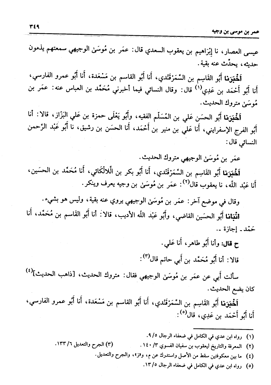 عيسى العصار نا إبراهيم بن يعقوب السعدي قال عمر بن موسى الوجيهي سمعتهم يذمون حديثه يحدث عنه بقية أخبرنا أبو القاسم بن السمرقندي أنا أبو القاسم بن مسعدة أنا أبو عمرو الفارسي أنا أبو أحمد بن عدي (1) قال وقال النسائي فيما أخبرني محمد بن العباس عنه عمر بن موسى متروك الحديث أخبرني أبو الحسن علي بن المسلم الفقيه وأبو يعلى حمزة بن علي البزاز قالا أنا أبو الفرج الإسفرايني أنا علي بن منير بن أحمد أنا الحسن بن رشيق نا أبو عبد الرحمن النسائي قال عمر بن موسى الوجيهي متروك الحديث أخبرنا أبو القاسم بن السمرقندي أنا أبو بكر بن اللالكائي أنا محمد بن الحسين أنا عبد الله نا يعقوب قال (2) عمر بن موسى بن وجيه يعرف وينكر وقال في موضع آخر عمر بن موسى الوجيهي يروي عنه بقية وليس هو بشئ أنبأنا أبو الحسين القاضي وأبو عبد الله الأديب قالا أنا أبو القاسم بن محمد أنا حمد إجازة ح قال وأنا أبو طاهر أنا علي قالا أنا أبو محمد بن أبي حاتم قال (3) سألت أبي عن عمر بن موسى الوجيهي فقال متروك الحديث ذاهب الحديث (4) كان يضع الحديث أخبرنا أبو القاسم بن السمرقندي أنا أبو القاسم بن مسعدة أنا أبو عمرو الفارسي أنا أبو أحمد بن عدي قال (5)