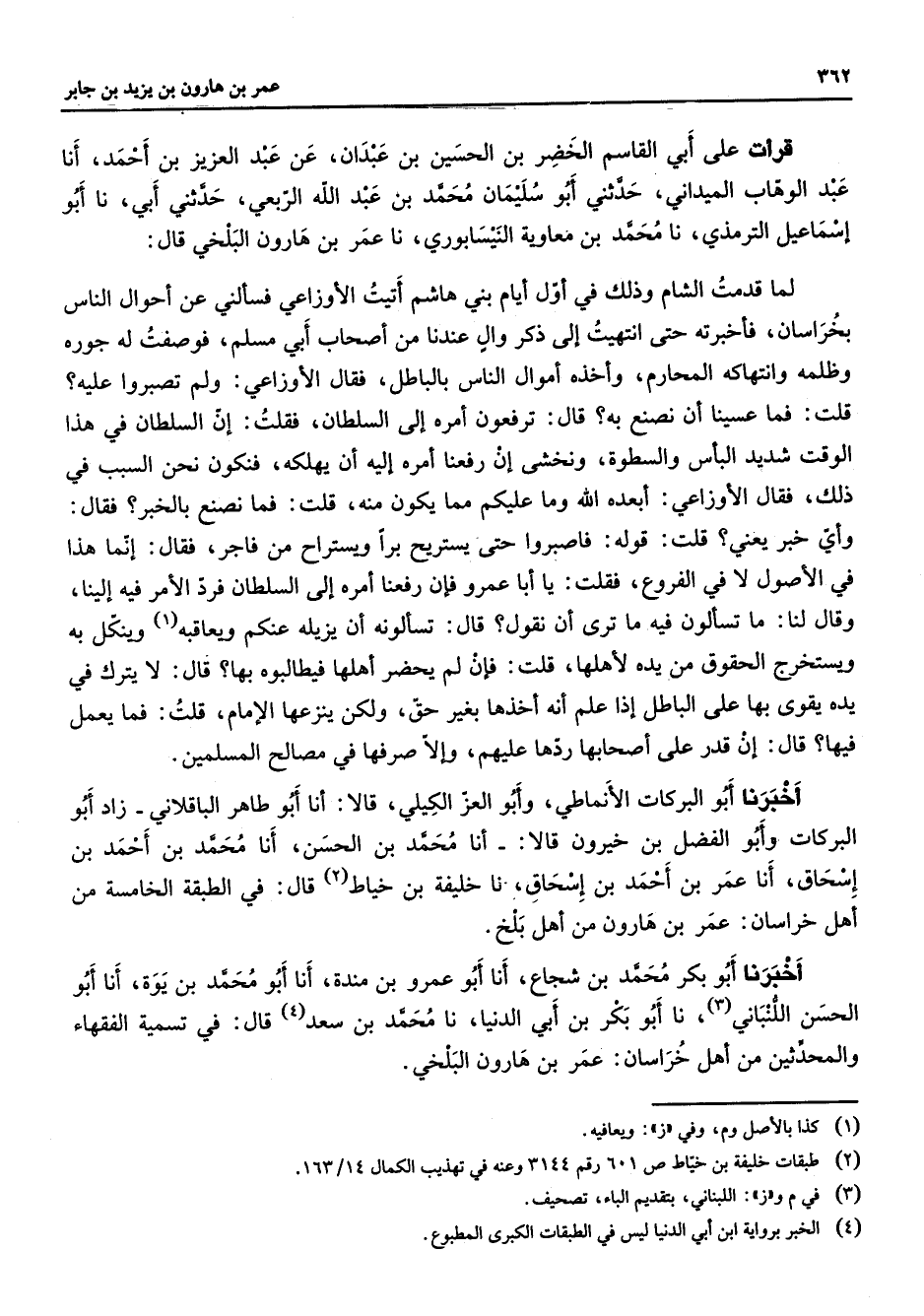 قرات على أبي القاسم الخضر بن الحسين بن عبدان عن عبد العزيز بن أحمد أنا عبد الوهاب الميداني حدثني أبو سليمان محمد بن عبد الله الربعي حدثني أبي نا أبو إسماعيل الترمذي نا محمد بن معاوية النيسابوري نا عمر بن هارون البلخي قال لما قدمت الشام وذلك في أول أيام بني هاشم أتيت الأوزاعي فسألني عن أحوال الناس بخراسان فأخبرته حتى انتهيت إلى ذكر وال عندنا من أصحاب أبي مسلم فوصفت له جوره وظلمه وانتهاكه المحارم وأخذه أموال الناس بالباطل فقال الأوزاعي ولم تصبروا عليه قلت فما عسينا أن نصنع به قال ترفعون أمره إلى السلطان فقلت إن السلطان في هذا الوقت شديد البأس والسطوة ونخشى إن رفعنا أمره إليه أن يهلكه فنكون نحن السبب في ذلك فقال الأوزاعي أبعده الله وما عليكم مما يكون منه قلت فما نصنع بالخبر فقال وأي خبر يعني قلت قوله فاصبروا حتى يستريح برا ويستراح من فاجر فقال إنما هذا في الأصول لا في الفروع فقلت يا أبا عمرو فإن رفعنا أمره إلى السلطان فرد الأمر فيه إلينا وقال لنا ما تسألون فيه ما ترى أن نقول قال تسألونه أن يزيله عنكم ويعاقبه (1) وينكل به ويستخرج الحقوق من يده لأهلها قلت فإن لم يحضر أهلها فيطالبوه بها قال لا يترك في يده يقوى بها على الباطل إذا علم أنه أخذها بغير حق ولكن ينزعها الإمام قلت فما يعمل إ فيها قال إن قدر على أصحابها ردها عليهم وإلاصرفها في مصالح المسلمين أخبرنا أبو البركات الأنماطي وأبو العز الكيلي قالا أنا أبو طاهر الباقلاني زاد أبو البركات وأبو الفضل بن خيرون قالا أنا محمد بن الحسن أنا محمد بن أحمد بن إسحاق أنا عمر بن أحمد بن إسحاق نا خليفة بن خياط (2) قال في الطبقة الخامسة من أهل خراسان عمر بن هارون من أهل بلخ أخبرنا أبو بكر محمد بن شجاع أنا أبو عمرو بن مندة أنا أبو محمد بن يوة أنا أبو الحسن اللنباني (3) نا أبو بكر بن أبي الدنيا نا محمد بن سعد (4) قال في تسمية الفقهاء والمحدثين من أهل خراسان عمر بن هارون البلخي