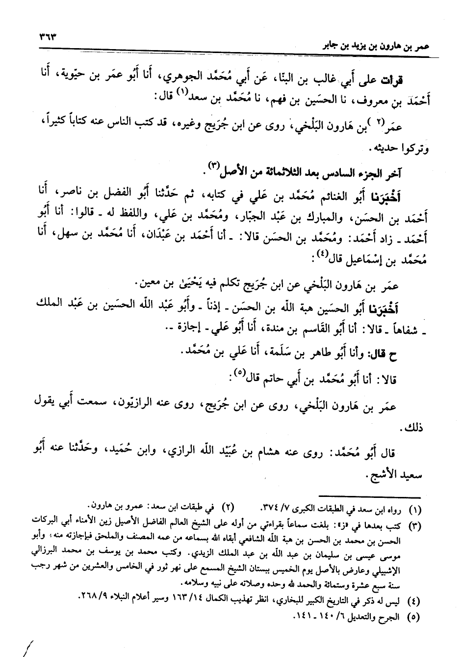 قرأت على ابي غالب بن البنا عن أبي محمد الجوهري أنا أبو عمر بن حيوية أنا أحمد بن معروف نا الحسين بن فهم نا محمد بن سعد (1) قال عمر (2) بن هارون البلخي روى عن ابن جريج وغيره قد كتب الناس عنه كتابا كثيرا وتركوا حديثه آخر الجزء السادس بعد الثلاثمائة من الأصل (3) أخبرنا أبو الغنائم محمد بن علي في كتابه ثم حدثنا أبو الفضل بن ناصر أنا أحمد بن الحسن والمبارك بن عبد الجبار ومحمد بن علي واللفظ له قالوا أنا أبو أحمد زاد أحمد ومحمد بن الحسن قالا أنا أحمد بن عبدان أنا محمد بن سهل أنا محمد بن إسماعيل قال (4) عمر بن هارون البلخي عن ابن جريج تكلم فيه يحيى بن معين أخبرنا أبو الحسين هبة الله بن الحسن إذنا وأبو عبد الله الحسين بن عبد الملك شفاها قالا أنا أبو القاسم بن مندة أنا أبو علي إجازة ح قال وأنا أبو طاهر بن سلمة أنا علي بن محمد قالا أنا أبو محمد بن أبي حاتم قال (5) عمر بن هارون البلخي روى عن ابن جريج روى عنه الرازيون سمعت أبي يقول ذلك قال أبو محمد روى عنه هشام بن عبيد الله الرازي وابن حميد وحدثنا عنه أبو سعيد الأشج