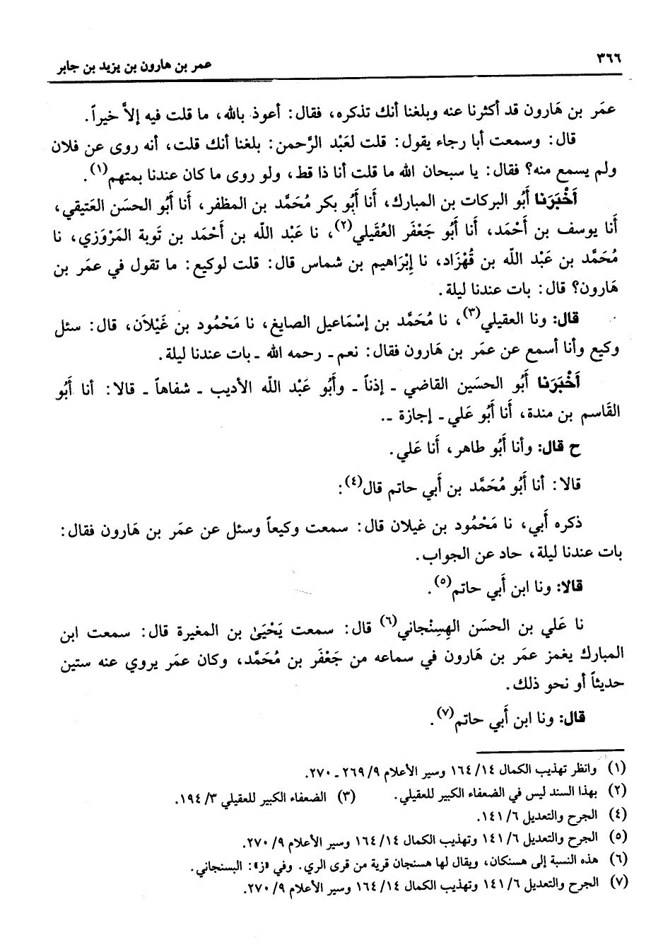 عمر بن هارون قد أكثرنا عنه وبلغنا أنك تذكره فقال أعوذ بالله ما قلت فيه إلا خيرا قال وسمعت أبا رجاء يقول قلت لعبد الرحمن بلغنا أنك قلت أنه روى عن فلان ولم يسمع منه فقال يا سبحان الله ما قلت أنا ذا قط ولو روى ما كان عندنا بمتهم (1) أخبرنا أبو البركات بن المبارك أنا أبو بكر محمد بن المظفر أنا أبو الحسن العتيقي أنا يوسف بن أحمد أنا أبو جعفر العقيلي (2) نا عبد الله بن أحمد بن توبة المروزي نا محمد بن عبد الله بن قهزاد نا إبراهيم بن شماس قال قلت لوكيع ما تقول في عمر بن هارون قابات عندنا ليلة قال ونا العقيلي (3) نا محمد بن إسماعيل الصايغ نا محمود بن غيلان قال سئل وكيع وأنا أسمع عن عمر بن هارون فقال نعم رحمه الله بات عندنا ليلة أخبرنا أبو الحسين القاضي إذنا وأبو عبد الله الأديب شفاها قالا أنا أبو القاسم بن مندة أنا أبو علي إجازة ح قال وأنا أبو طاهر أنا علي قالا أنا أبو محمد بن أبي حاتم قال (4) ذكره أبي نا محمود بن غيلان قال سمعت وكيعا وسئل عن عمر بن هارون فقال بات عندنا ليلة حاد عن الجواب قالا ونا ابن أبي حاتم (5) نا علي بن الحسن الهسنجاني (6) قال سمعت يحيى بن المغيرة قال سمعت ابن المبارك يغمز عمر بن هارون في سماعه من جعفر بن محمد وكان عمر يروي عنه ستين حديثا أو نحو ذلك قال ونا ابن أبي حاتم (7)