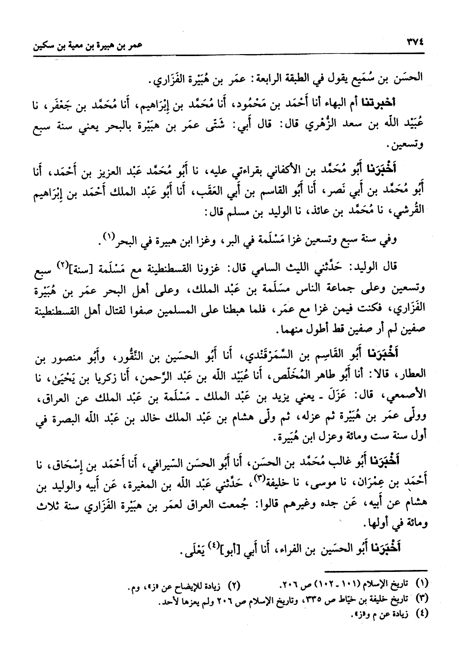 الحسن بن سميع يقول في الطبقة الرابعة عمر بن هبيرة الفزاري أخبرتنا أم البهاء أنا أحمد بن محمود أنا محمد بن إبراهيم أنا محمد بن جعفر نا عبيد الله بن سعد الزهري قال قال أبي شتى عمر بن هبيرة بالبحر يعني سنة سبع وتسعين أخبرنا أبو محمد بن الأكفاني بقراءتي عليه نا أبو محمد عبد العزيز بن أحمد أنا أبو محمد بن أبي نصر أنا أبو القاسم بن أبي العقب أنا أبو عبد الملك أحمد بن إبراهيم القرشي نا محمد بن عائذ نا الوليد بن مسلم قال وفي سنة سبع وتسعين غزا مسلمة في البر وغزا ابن هبيرة في البحر (1) قال الوليد حدثني الليث السامي قال غزونا القسطنطينة مع مسلمة سنة (2) سبع وتسعين وعلى جماعة الناس مسلمة بن عبد الملك وعلى أهل البحر عمر بن هبيرة الفزاري فكنت فيمن غزا مع عمر فلما هبطنا على المسلمين صفوا لقتال أهل القسطنطينة صفين لم أر صفين قط أطول منهما أخبرنا أبو القاسم بن السمرقندي أنا أبو الحسين بن النقور وأبو منصور بن العطار قالا أنا أبو طاهر المخلص أنا عبيد الله بن عبد الرحمن أنا زكريا بن يحيى نا الأصمعي قال عزل يعني يزيد بن عبد الملك مسلمة بن عبد الملك عن العراق وولى عمر بن هبيرة ثم عزله ثم ولى هشام بن عبد الملك خالد بن عبد الله البصرة في أول سنة ست ومائة وعزل ابن هبيرة أخبرنا أبو غالب محمد بن الحسن أنا أبو الحسن السيرافي أنا أحمد بن إسحاق نا أحمد بن عمران نا موسى نا خليفة (3) حدثني عبد الله بن المغيرة عن أبيه والوليد بن هشام عن أبيه عن جده وغيرهم قالوا جمعت العراق لعمر بن هبيرة الفزاري سنة ثلاث ومائة في أولها أخبرنا أبو الحسين بن الفراء أنا أبي أبو (4) يعلى