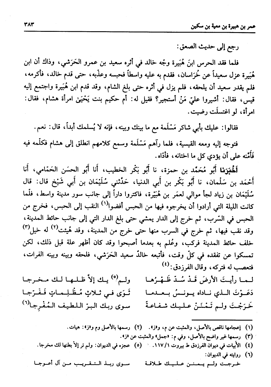 رجع إلى حديث الصعق فلما فقد الحرس ابن هبيرة وجه خالد في أثره سعيد بن عمرو الحرشي وذاك أن ابن هبيرة عزل سعيدا عن خراسان فقدم به عليه واسطا فحبسه وعذبه حتى قدم خالد فأكرمه فلم يقدر سعيد أن يلحقه فلم يزل في أثره حتى بلغ الشام وقد قدم ابن هبيرة واجتمع إليه قيس فقال أشيروا علي من أستجير فقيل له أم حكيم بنت يحيى امرأة هشام فقال امرأة لو اغتسلت رضيت فقالوا عليك بأبي شاكر مسلمة مع ما بينك وبينه فإنه لا يسلمك أبدا قال نعم فتوجه إليه ومعه القيسية فلما رآهم مسلمة وسمع كلامهم انطلق إلى هشام فكلمه فيه فأمنه على أن يؤدي كل ما اختانه فأداه أخبرنا أبو محمد بن حمزة نا أبو بكر الخطيب أنا أبو الحسن الحمامي أنا أحمد بن سلمان نا أبو بكر بن أبي الدنيا حدثني سليمان بن أبي شيخ قال قال سليمان بن زياد لجأ موالي لعمر بن هبيرة فاكتروا دارا إلى جانب سور مدينة واسط فلما كانت الليلة التي أرادوا أن يخرجوه فيها من الحبس أفضوا (1) النقب إلى الحبس فخرج من الحبس في السرب ثم خرج إلى الدار يمشي حتى بلغ الدار التي إلى جانب حائط المدينة وقد نقب فيها ثم خرج في السرب منها حتى خرج من المدينة وقد هيئت (2) له خيل (3) خلف حائط المدينة فركب وعلم به بعدما أصبحوا وقد كان أظره رعلة قبل ذلك لكن تمسكوا عن تفقده في كل وقت فأتبعه خالد سعيد الحرشي فلحقه وبينه وبينه الفرات فتعصب له فتركه وقال الفرزدق (4) * لما رأيت الأرض قد سد ظهرها * ولم (5) يك إلا ظلها لك مخرجا دعوت الذي ناداه يونس بعدما * ثوى في ثلاث مظلمات ففرجا خرجت ولم تمنن عليك شفاعة * سوى ربك البر اللطيف المفرجا (6)