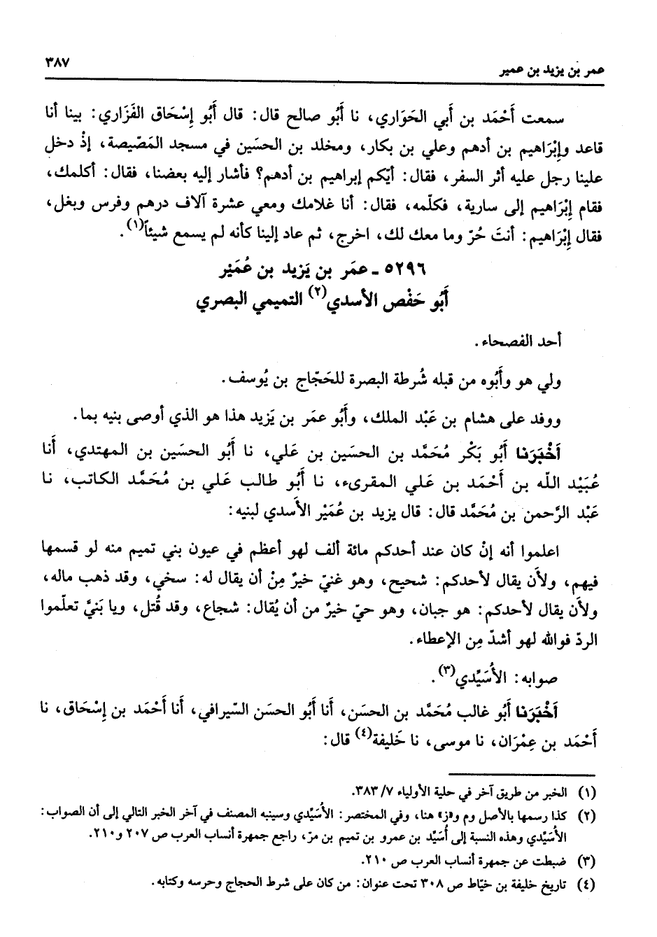 5296 - عمر بن يزيد بن عمير أبو حفص الأسدي (2) التميمي البصري أحد الفصحاء ولي هو وأبوه من قبله شرطة البصرة للحجاج بن يوسف ووفد على هشام بن عبد الملك وأبو عمر بن يزيد هذا هو الذي أوصى بنيه بما أخبرنا أبو بكر محمد بن الحسين بن علي نا أبو الحسين بن المهتدي أنا عبيد الله بن أحمد بن علي المقرئ نا أبو طالب علي بن محمد الكاتب نا عبد الرحمن بن محمد قال قال يزيد بن عمير الأسدي لبنيه اعلموا أنه إن كان عند أحدكم مائة ألف لهو أعظم في عيون بني تميم منه لو قسمها فيهم ولأن يقال لأحدكم شحيح وهو غني خير من أن يقال له سخي وقد ذهب ماله ولأن يقال لأحدكم هو جبان وهو حي خير من أن يقال شجاع وقد قتل ويا بني تعلموا الرد فوالله لهو أشد من الإعطاء صوابه الأسيدي (3) أخبرنا أبو غالب محمد بن الحسن أنا أبو الحسن السيرافي أنا أحمد بن إسحاق نا أحمد بن عمران نا موسى نا خليفة (4) قال
