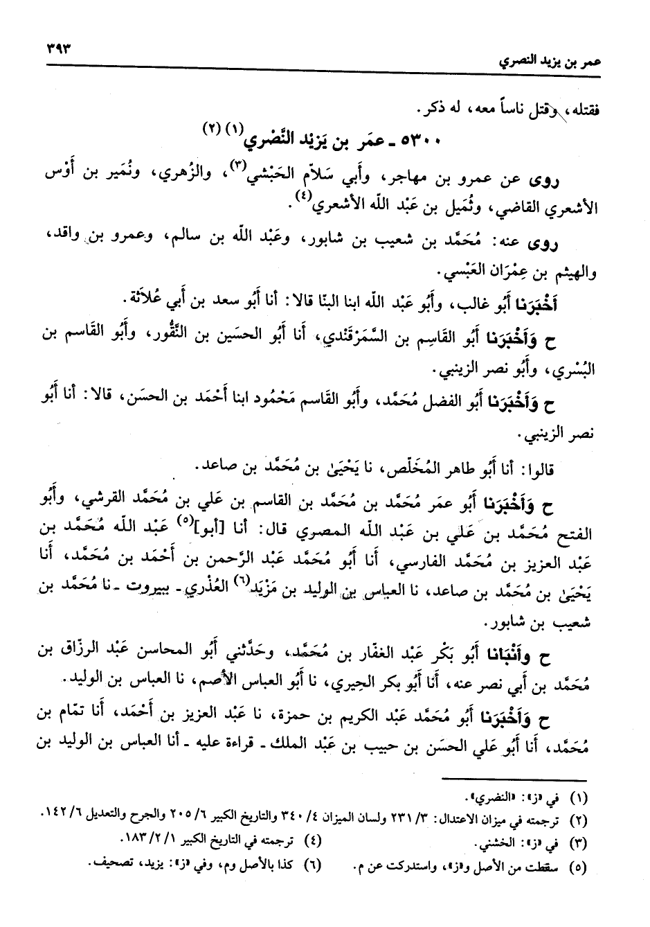 5300 - عمر بن يزيد النصري (1) (2) روى عن عمرو بن مهاجر وأبي سلام الحبشي (3) والزهري ونمير بن أوس الأشعري القاضي وثميل بن عبد الله الأشعري (4) روى عنه محمد بن شعيب بن شابور وعبيد الله بن سالم وعمرو بن واقدو الهيثم بن عمران العبسي أخبرنا أبو غالب وأبو عبد الله ابنا البنا قالا أنا أبو سعد بن أبي علاثة ح وأخبرنا أبو القاسم بن السمرقندي أنا أبو الحسين با النقور وأبو القاسم بن البسري وأبو نصر الزينبي ح وأخبرنا أبو الفضل محمد وأبو القاسم محمود ابنا أحمد بن الحسن قالا أنا أبو نصر الزينبي قالوا أنا أبو طاهر المخلص نا يحيى بن محمد بن صاعد ح وأخبرنا أبو عمر محمد بن محمد بن القاسم بن علي بن محمد القرشي وأبو الفتح محمد بن علي بن عبد الله المصري قال أنا أبو (5) عبد الله محمد بن عبد العزيز بن محمد الفارسي أنا أبو محمد عبد الرحمن بن أحمد بن محمد أنا يحيى بن محمد بن صاعد نا العباس بن الوليد بن مزيد (5) العذري ببيروت نا محمد بن شعيب بن شابور ح وأنبأنا أبو بكر عبد الغفار بن محمد وحدثني أبو المحاسن عبد الرزاق بن محمد بن أبي نصر عنه أنا أبو بكر الحيري نا أبو العباس الأصم نا العباس بن الوليد ح وأخبرنا أبو محمد عبد الكريم بن حمزة نا عبد العزيز بن أحمد أنا تمام بن محمد أنا أبو علي الحسن بن حبيب بن عبد الملك قراءة عليه أنا العباس بن الوليد بن