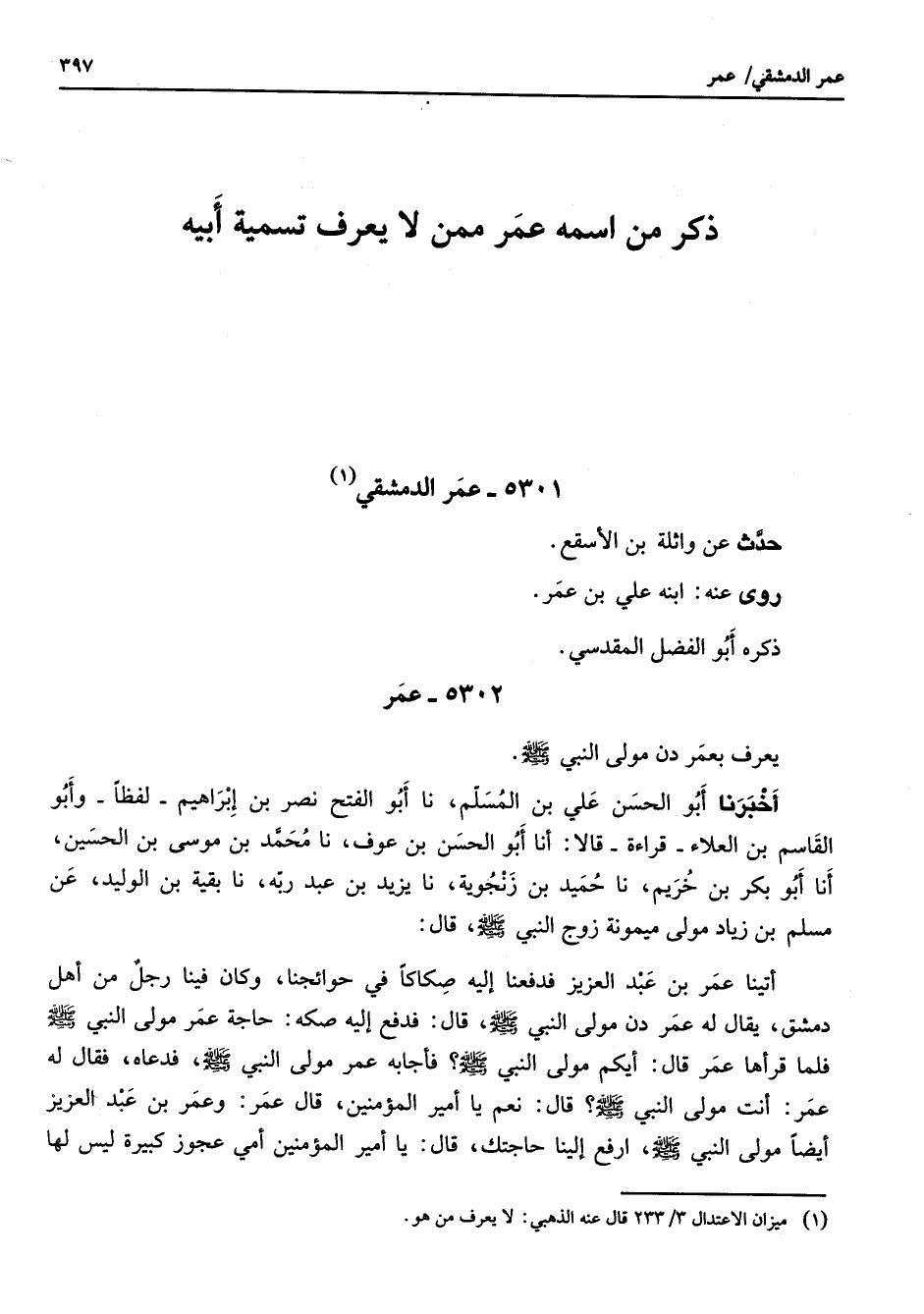 5301 - عمر الدمشقي (1) حدث عن واثلة بن الأسقع روى عنه ابنه علي بن عمر ذكره أبو الفضل المقدسي 5302 عمر يعرف بعمر دن مولى النبي (صلى الله عليه وسلم) أخبرنا أبو الحسن علي بن المسلم نا أبو الفتح نصر بن إبراهيم لفظا وأبو القاسم بن العلاء قراءة قالا أنا أبو الحسن بن عوف نا محمد بن موسى بن الحسين أنا أبو بكر بن خريم نا حميد بن زنجوية نا يزيد بن عبد ربه نا بقية بن الوليد عن مسلم بن زياد مولى ميمونة زوج النبي (صلى الله عليه وسلم) قال أتينا عمر بن عبد العزيز فدفعنا إليه صكاكا في حوائجنا وكان فينا رجل من أهل دمشق يقال له عمر دن مولى النبي (صلى الله عليه وسلم) قال فدفع إليه صكه حاجة عمر مولى النبي (صلى الله عليه وسلم) فلما قرأها عمر قال أيكم مولى النبي (صلى الله عليه وسلم) فأجابه عمر مولى النبي (صلى الله عليه وسلم) فدعاه فقال له عمر أنت مولى النبي (صلى الله عليه وسلم) قال نعم يا أمير المؤمنين قال عمر وعمر بن عبد العزيز أيضا مولى النبي (صلى الله عليه وسلم) ارفع إلينا حاجتك قال يا أمير المؤمنين أمي عجوز كبيرة ليس لها