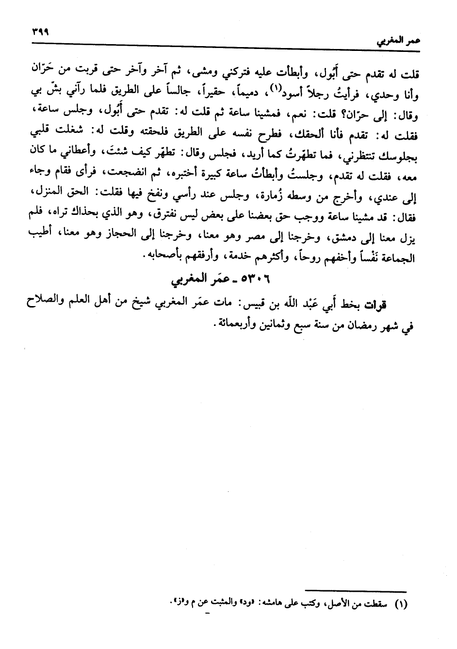 5306 - عمر المغربي قرأت بخط أبي عبد الله بن قبيس مات عمر المغربي شيخ من أهل العلم والصلاح في شهر رمضان من سنة سبع وثمانين وأربعمائة "