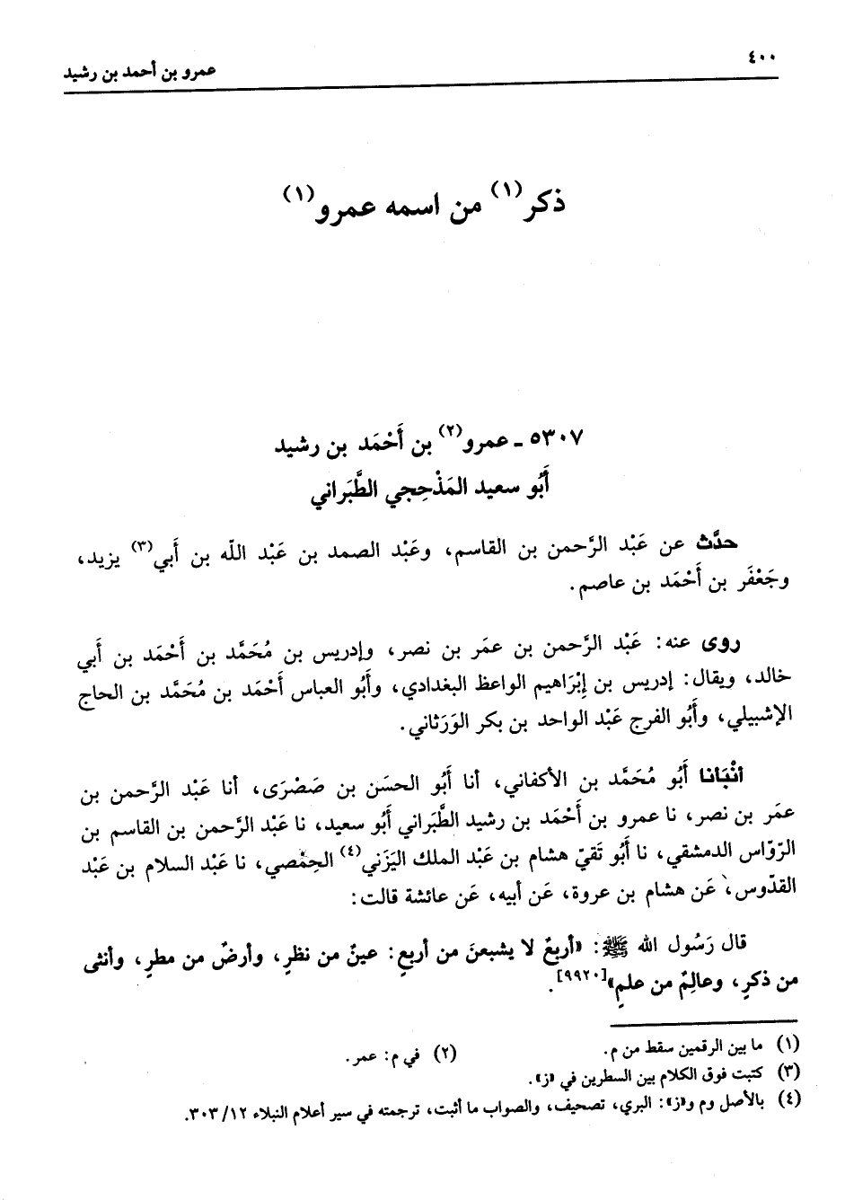 5307 - عمرو (2) بن أحمد بن رشيد أبو سعيد المذحجي الطبراني حدث عن عبد الرحمن بن القاسم وعبد الصمد بن عبد الله بن أبي (3) يزيد وجعفر بن أحمد بن عاصم روى عنه عبد الرحمن بن عمر بن نصر وإدريس بن محمد بن أحمد بن أبي خالد ويقال إدريس بن إبراهيم الواعظ البغدادي وأبو العباس أحمد بن محمد بن الحاج الإشبيلي وأبو الفرج عبد الواحد بن بكر الورثاني أنبأنا أبو محمد بن الأكفاني أنا أبو الحسن بن صصرى أنا عبد الرحمن بن عمر بن نصر نا عمرو بن أحمد بن رشيد الطبراني أبو سعيد نا عبد الرحمن بن القاسم بن الرواس الدمشقي نا أبو تقي هشام بن عبد الملك اليزني (4) الحمصي نا عبد السلام بن عبد القدوس عن هشام بن عروة عن أبيه عن عائشة قالت قال رسول الله صلى الله عليه وسلم) أربع لا يشبعن من أربع عين من نظر وأرض من مطر وأنثى من مذكر وعالم من علم