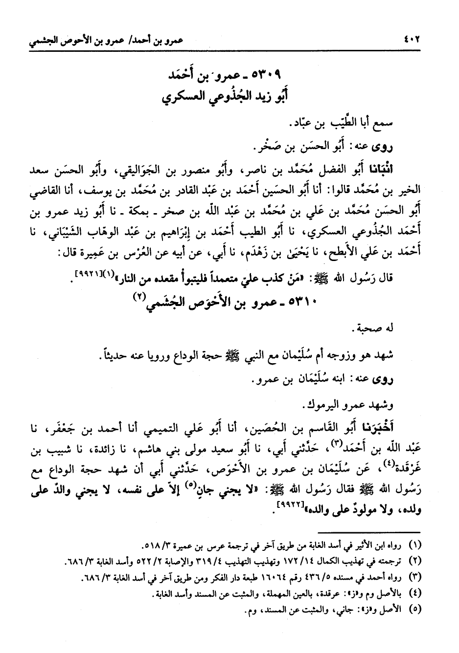 5310 - عمرو بن الأحوص الجشمي (2) له صحبة شهد هو وزوجه أم سليمان مع النبي (صلى الله عليه وسلم) حجة الوداع ورويا عنه حديثا روى عنه ابنه سليمان بن عمرو وشهد عمرو اليرموك أخبرنا أبو القاسم بن الحصين أنا أبو علي التميمي أنا أحمد بن جعفر نا عبد الله بن أحمد (3) حدثني أبي نا أبو سعيد مولى بني هاشم نا زائدة نا شبيب بن غرقدة (3) عن سليمان بن عمرو بن الأحوص حدثني أبي أن شهد حجة الوداع مع رسول الله (صلى الله عليه وسلم) فقال رسول الله (صلى الله عليه وسلم) لا يجني جان (5) إلا على نفسه لا يجني والد على ولده ولا مولود على والده