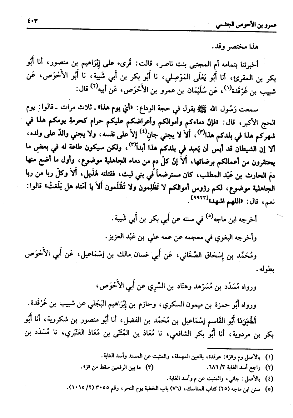 هذا مختصر وقد أخبرتنا بتمامه أم المجتبى بنت ناصر قالت قرئ على إبراهيم بن منصور أنا أبو بكر بن المقرئ أنا أبو يعلى الموصلي نا أبو بكر بن أبي شيبة نا أبو الأحوص عن شبيب بن غرقدة (1) عن سليمان بن عمرو بن الأحوص عن أبيه (2) قال سمعت رسول الله (صلى الله عليه وسلم) يقول في حجة الوداع أي يوم هذا ثلاث مرات قالوا يوم الحج الأكبر قال فإن دماءكم وأموالكم وأعراضكم عليكم حرام كحرمة يومكم هذا في شهركم هذا في بلدكم هذا (3) ألا لا يجني جان (4) إلا على نفسه ولا يجني والد على ولده ألا إن الشيطان قد أيس أن يعبد في بلدكم هذا أبدا (3) ولكن سيكون طاعة له في بعض ما يحتقرون من أعمالكم برضائها ألا إكل دم من دماء الجاهلية موضوع وأول ما أضع منها دم الحارث بن عبد المطلب كامسترضعا في بني ليث فقتلته هذيل ألا وكل ربا من ربا الجاهلية موضوع لكم رؤوس أموالكم لا تظلمون ولا تظلمون ألا يا أمتاه هل بلغت قالوا نعم قال اللهم اشهد أخرجه ابن ماجه (5) في سننه عن أبي بكر بن أبي شيبة وأخرجه البغوي في معجمه عن عمه علي بن عبد العزيز ومحمد بن إسحاق الصغاني عن أبي غسان مالك بن إسماعيل عن أبي الأحوص بطوله ورواه مسدد بن مسرهد وهناد بن السري عن أبي الأحوص ورواه أبو حمزة بن ميمون السكري وحازم بن إبراهيم البجلي عن شبيب بن غرقدة أخبرنا أبو القاسم إسماعيل بن محمد بن الفضل أنا أبو منصور بن شكروية أنا أبو بكر بن مردوية أنا أبو بكر الشافعي نا معاذ بن المثنى بن معاذ العنبري نا مسدد بن