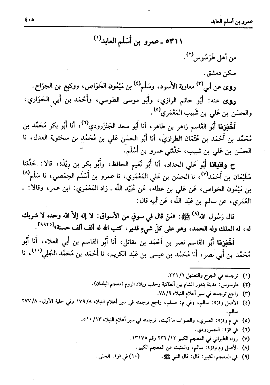 5311 - عمرو بن أسلم العابد (1) من أهل طرسوس (2) سكن دمشق روى عن أبي (3) معاوية الأسود وسلم (4) بن ميمون الخواص ووكيع بن الجراح روى عنه أبو حاتم الرازي وأبو موسى الطوسي وأحمد بن أبي الحواري والحسن بن علي بن شبيب المعمري (5) أخبرنا أبو القاسم زاهر بن طاهر أنا أبو سعد الجنزرودي (6) أنا أبو بكر محمد بن محمد بن أحمد بن عثمان الطرازي أنا أبو الحسن علي بن محمد بن سختوية العدل نا الحسن بن علي بن شبيب حدثني عمرو بن أسلم ح وأنبأنا أبو علي الحداد أنا أبو نعيم الحافظ وأبو بكر بن ريذة قالا حدثنا سليمان بن أحمد (7) نا الحسن بن علي المعمري نا عمرو بن أسلم الحمصي نا سلم (8) بن ميمون الخواص عن علي بن عطاء عن عبيد الله زاد المعمري ابن عمر وقالا العمري عن سالم بن عبد الله عن أبيه قال قال رسول الله (9) (صلى الله عليه وسلم) من قال في سوق من الأسواق لا إله إلا الله وحده لا شريك له له الملك وله الحمد وهو على كل شئ قدير كتب الله له ألف ألف حسنة أخبرنا أبو القاسم نصر بن أحمد بن مقاتل أنا أبو القاسم بن أبي العلاء أنا أبو محمد بن أبي نصر أنا محمد بن عيسى بن عبد الكريم نا أحمد بن محمد الجلي (10) نا