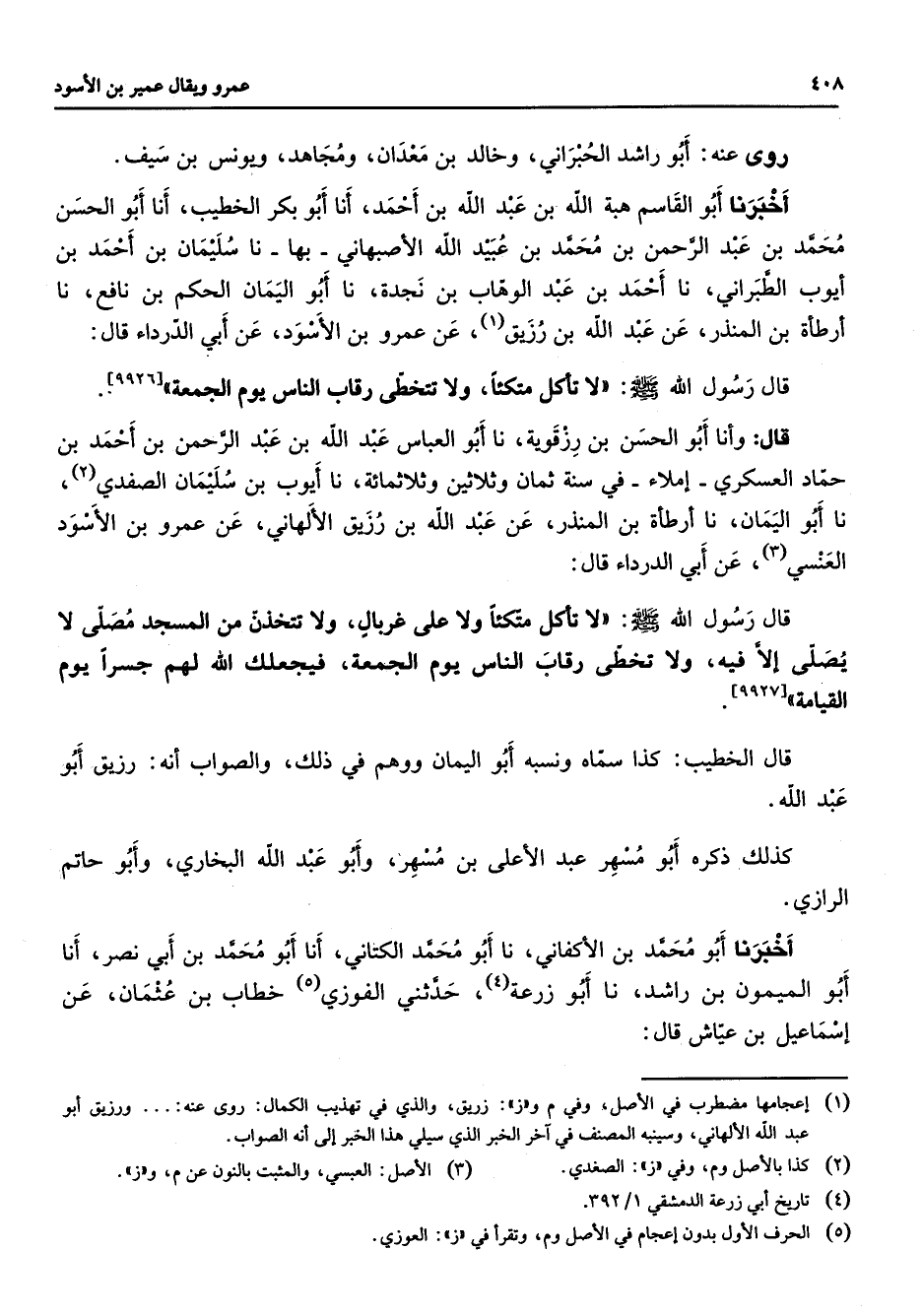 روى عنه أبو راشد الحبراني وخالد بمعدان ومجاهد ويونس بن سيف أخبرنا أبو القاسم هبة الله بن عبد الله بن أحمد أنا أبو بكر الخطيب أنا أبو الحسن محمد بن عبد الرحمن بن محمد بن عبيد الله الأصبهاني بها نا سليمان بن أحمد بن أيوب الطبراني نا أحمد بن عبد الوهاب بن نجدة نا أبو اليمان الحكم بن نافع نا أرطأة بن المنذر عن عبد الله بن رزيق (1) عن عمرو بن الأسود عن أبي الدرداء قال قال رسول الله (صلى الله عليه وسلم) لا تأكل متكئا ولا تتخطى رقاب الناس يوم الجمعة قال وأنا أبو الحسن بن رزقوية نا أبو العباس عبد الله بن عبد الرحمن بن أحمد بن حماد العسكري إملاء في سنة ثمان وثلاثين وثلاثمائة نا أيوب بن سليمان الصفدي (2) نا أبو اليمان نا أرطأة بن المنذر عن عبد الله بن رزيق الألهاني عن عمرو بن الأسود العنسي (3) عن أبي الدرداء قال قال رسول الله (صلى الله عليه وسلم) لا تأكل متكئا ولا على غربا ولا تتخذن من المسجد مصلى لا يصلى إلا فيه ولا تخطى رقاب الناس يوم الجمعة فيجعلك الله لهم جسرا يوم القيامة قال الخطيب كذا سماه ونسبه أبو اليما ووهم في ذلك والصواب أنه رزيق أبو عبد الله كذلك ذكره أبو مسهر عبد الأعلى بن مسهر وأبو عبد الله البخاري وأبو حاتم الرازي أخبرنا أبو محمد بن الأكفاني نا أبو محمد الكتاني أنا أبو محمد بن أبي نصر أنا أبو الميمون بن راشد نا أبو زرعة (4) حدثني الفوزي (5) خطاب بن عثمان عن إسماعيل بن عياش قال