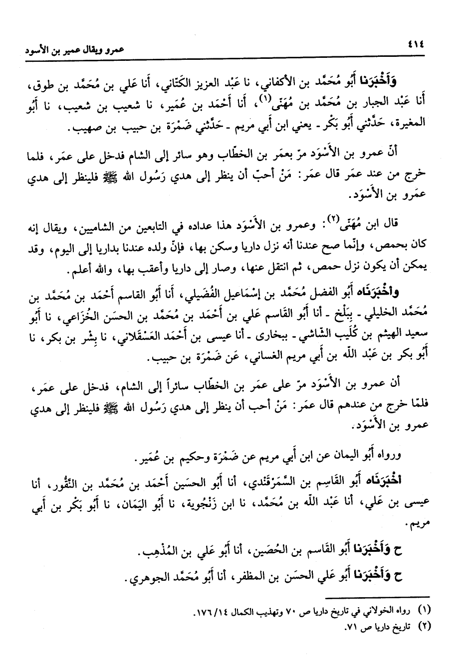 وأخبرنا أبو محمد بن الأكفاني نا عبد العزيز الكتاني أنا علي بن محمد بن طوق أنا عبد الجبار بن محمد بن مهنى (1) أنا أحمد بن عمير نا شعيب بن شعيب نا أبو المغيرة حدثني أبو بكر يعني ابن أبي مريم حدثني ضمرة بن حبيب بن صهيب أن عمرو بن الأسود مر بعمر بن الخطاب وهو سائر إلى الشام فدخل على عمر فلما خرج عند عمر قال عمر من أحب أن ينظر إلى هدي رسول الله (صلى الله عليه وسلم) فلينظر إلى هدي عمرو بن الأسود قال ابن مهنى (2) وعمرو بن الأسود هذا عداده في التابعين من الشاميين ويقال إنه كان بحمص وإنما صح عندنا أنه نزل داريا وسكن بها فإن ولده عندنا بداريا إلى اليوم وقد يمكن أن يكون نزل حمص ثم انتقل عنها وصار إلى داريا وأعقب بها والله أعلم وأخبرناه أبو الفضل محمد بن إسماعيل الفضيليأنا أبو القاسم أحمد بن محمد بن محمد الخليلي ببلخ أنا أبو القاسم علي بن أحمد بن محمد بن الحسن الخزاعي نا أبو سعيد الهيثم بن كليب الشاشي ببخارى أنا عيسى بن أحمد العسقلاني نا بشر بن بكر نا أبو بكر بن عبد الله بن أبي مريم الغساني عن ضمرة بن حبيب أن عمرو بن الأسود مر على عمر بن الخطاب سائرا إلى الشام فدخل على عمر فلما خرج من عندهم قال عمر من أحب أن ينظر إلى هدي رسول الله (صلى الله عليه وسلم) فلينظر إلى هدي عمرو بن الأسود ورواه أبو اليمان عن ابن أبي مريم عن ضمرة وحكيم بن عمير أخبرناه أبو القاسم بن السمرقندي أنا أبو الحسين أحمد بن محمد بن النقور أنا عيسى بن علي أنا عبد الله بن محمد نا ابن زنجوية نا أبو اليمان نا أبو بكر بن أبي مريم ح وأخبرنا أبو القاسم بن الحصين أنا أبو علي بن المذهب ح وأخبرنا أبو علي الحسن بن المظفر أنا أبو محمد الجوهري