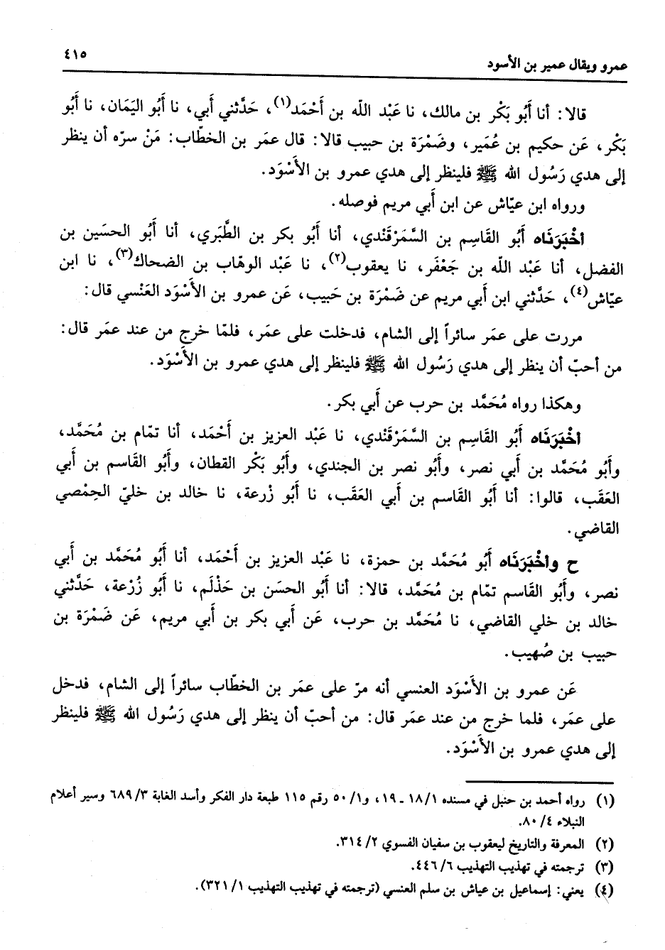 (1) رواه أحمد بن حنبل في مسنده 1 / 18 - 19، و 1 / 50 رقم 115 طبعة دار الفكر وأسد الغابة 3 / 689 وسير أعلام النبلاء 4 / 80