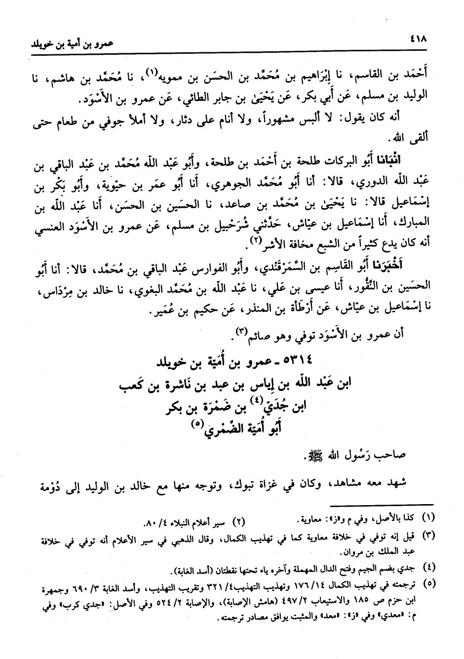 314 - عمرو بن أمية بن خويلد بن عبد الله بن إياس بن عبد بن ناشرة بن كعب بن جدي (4) ضمرة بن بكر أبو أمية الضمري (5) صاحب رسول الله (صلى الله عليه وسلم) شهد معه مشاهد وكان في غزاة تبوك وتوجه منها مع خالد بن الوليد إلى دومة