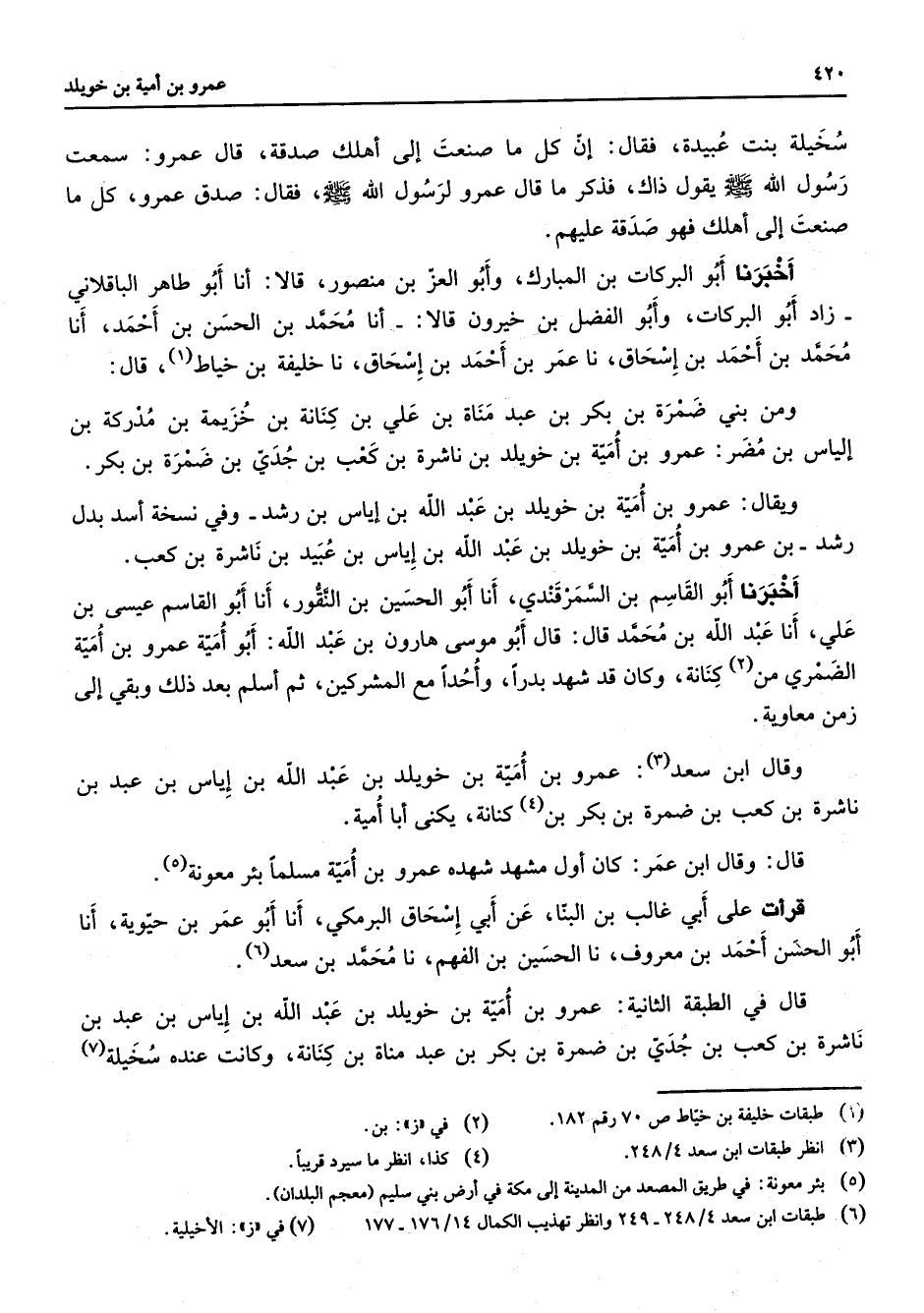 سخيلة بنت عبيدة فقال إن كل ما صنعت إلى أهلك صدقة قال عمرو سمعت رسول الله (صلى الله عليه وسلم) يقول ذاك فذكر ما قاعمرو لرسول الله (صلى الله عليه وسلم) فقال صدق عمرو كل ما صنعت إلى أهلك فهو صدقة عليهم أخبرنا أبو البركات بن المبارك وأبو العز بن منصور قالا أنا أبو طاهر الباقلاني زاد أبو البركات وأبو الفضل بن خيرون قالا أنا محمد بن الحسن بن أحمد أنا محمد بن أحمد بن إسحاق نا عمر بن أحمد بن إسحاق نا خليفة بن خياط (1) قال ومن بني ضمرة بن بكر بن عبد مناة بن علي بن كنانة بن خزيمة بن مدركة بن إلياس بن مضر عمرو بن أمية بن خويلد بن ناشرة بن كعب بن جدي بن ضمرة بن بكر ويقال عمرو بن أمية بن خويلد بن عبد الله بن إياس بن رشد وفي نسخة أسد بدل رشدبن عمرو بن أمية بن خويلد بن عبد الله بن إياس بن عبيد بن ناشرة بن كعب أخبرنا أبو القاسم بن السمرقندي أنا أبو الحسين بن النقور أنا أبو القاسم عيسى بن علي أنا عبد الله بن محمد قال قال أبو موسى هارون بن عبد الله أبو أمية عمرو بن أمية الضمري من (2) كنانة وكان قد شهد بدرا وأحدا مع المشركين ثم أسلم بعد ذلك وبقي إلى زمن معاوية وقال ابن سعد (3) عمرو بن أمية بن خويلد بن عبد الله بن إياس بن عبد بن ناشرة بن كعب بن ضمرة بن بكر بن (4) كنانة يكنى أبا أمية قال وقال ابن عمر كان أول مشهد شهده عمرو بن أمية مسلما بئر معونة قرأت على أبي غالب بن البنا عن أبي إسحاق البرمكي أنا أبو عمر بن حيوية أنا أبو الحسن أحمد بن معروف نا الحسين بن الفهم نا محمد بن سعد (6) قال في الطبقة الثانية عمرو بن أمية بن خويلد بن عبد الله بن إياس بن عبد بن ناشرة بن كعب بن جدي بن ضمرة بن بكر بن عبد مناة بن كنانة وكانت عنده سخيلة (7)