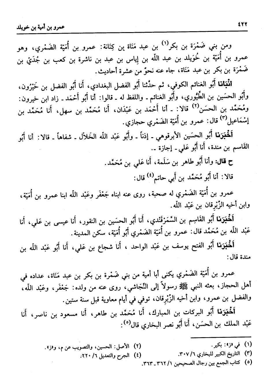 ومن بني ضمرة بن بكر (1) بن عبد مناة بن كنانة عمرو بن أمية الضمري وهو عمرو بن أمية بن خويلد بن عبد الله بن إياس بن عبد بن ناشرة بكعب بن جدي بن ضمرة بن بكر بن عبد مناة جاء عنه نحو من عشرة أحاديث أنبأنا أبو الغنائم الكوفي ثم حدثنا أبو الفضل البغدادي أنا أبو الفضل بن خيرون وأبو الحسين بن الطيوري وأبو الغنائم واللفظ له قالوا أنا أبو أحمد زاد ابن خيرون ومحمد بن الحسن (2) قالا أنا أحمد بن عبدان أنا محمد بن سهل أنا محمد بن إسماعيل قال عمرو بن أمية الضمري حجازي أخبرنا أبو الحسين الأبرقوهي إذنا وأبو عبد الله الخلال شفاها قالا أنا أبو القاسم بن مندة أنا أبو علي إجازة ح قال وأنا أبو طاهر بن سلمة أنا علي بن محمد قالا أنا أبو محمد بن أبي حاتم (4) قال عمرو بن أمية الضمري له صحبة روى عنه ابناه جعفر وعبد الله ابنا عمرو بن أمية وابن أخيه الزبرقان بن عبد الله أخبرنا أبو القاسم بن السمرقندي أنا أبو الحسين بن النقور أنا عيسى بن علي أنا عبد الله بن محمد قال عمرو بن أمية الضمري أبو أمية سكن المدينة أخبرنا أبو الفتح يوسف بن عبد الواحد أنا شجاع بن علي أنا أبو عبد الله بن مندة قال عمرو بن أمية الضمري يكنى أبا أمية من بني ضمرة بن بكر بن عبد مناة عداده في أهل الحجاز بعثه النبي (صلى الله عليه وسلم) رسولا إلى النجاشي روى عنه من ولده جعفر وعبد الله والفضل بن عمرو وابن أخيه الزبرقان توفي في أيام معاوية قبل سنة ستين أخبرنا أبو البركات بن المبارك أنا محمد بن طاهر أنا مسعود بن ناصر أنا عبد الملك بن الحسن أنا أبو نصر البخاري قال (5)