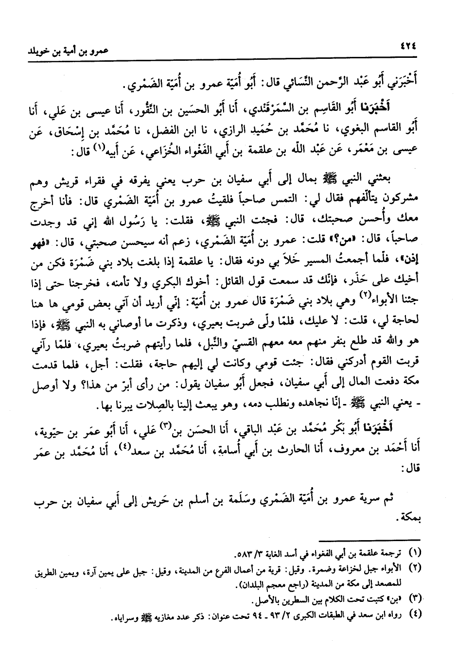 أخبرني أبو عبد الرحمن النسائي قال أبو أمية عمرو بن أمية الضمري أخبرنا أبو القاسم بن السمرقندي أنا أبو الحسين بن النقور أنا عيسى بن علي أنا أبو القاسم البغوي نا محمد بن حميد الرازي نا ابن الفضل نا محمد بن إسحاق عن عيسى بن معمر عن عبد الله بن علقمة بن أبي الفغواء الخزاعي عن أبيه (1) قال بعثني النبي (صلى الله عليه وسلم) بمال إلى أبي سفيان بن حرب يعني يفرقه في فقراء قريش وهم مشركون يتألفهم فقال لي التمس صاحبا فلقيت عمرو بن أمية الضمري قال فأنا أخرج معك وأحسن صحبتك قال فجئت النبي (صلى الله عليه وسلم) فقلت يا رسول الله إني قد وجدت صاحبا قال من قلت عمرو بن أمية الضمري زعم أنه سيحسن صحبتي قال فهو إذن فلما أجمعت المسير خلا بي دونه فقال يا علقمة إذا بلغت بلاد بني ضمرة فكن من أخيك على حذر فإنك قد سمعت قول القائل أخوك البكري ولا تأمنه فخرجنا حتى إذا جئنا الأبواء (2) وهي بلاد بني ضمرة قال عمرو بن أمية إني أريد أن آتي بعض قومي ها هنا لحاجة لي قلت لا عليك فلما ولى ضربت بعيري وذكرت ما أوصاني به النبي (صلى الله عليه وسلم) فإذا هو والله قد طلع بنفر منهم معه معهم القسي والنبل فلما رأيتهم ضربت بعيري فلما رآني قربت القوم أدركني فقال جئت قومي وكانت لي إليهم حاجة فقلت أجل فلما قدمت مكة دفعت المال إلى أبي سفيان فجعل أبو سفيان يقول من رأى أبر من هذا ولا أوصل يعني النبي (صلى الله عليه وسلم) إنا نجاهده ونطلب دمه وهو يبعث إلينا بالصلات يبرنا بها أخبرنا أبو بكر محمد بن عبد الباقي أنا الحسن بن (3) علي أنا أبو عمر بن حيوية أنا أحمد بن معروف أنا الحارث بن أبي أسامة أنا محمد بن سعد (4) أنا محمد بن عمر قال ثم سرية عمرو بن أمية الضمري وسلمة بن أسلم بن حريش إلى أبي سفيان بن حرب بمكة