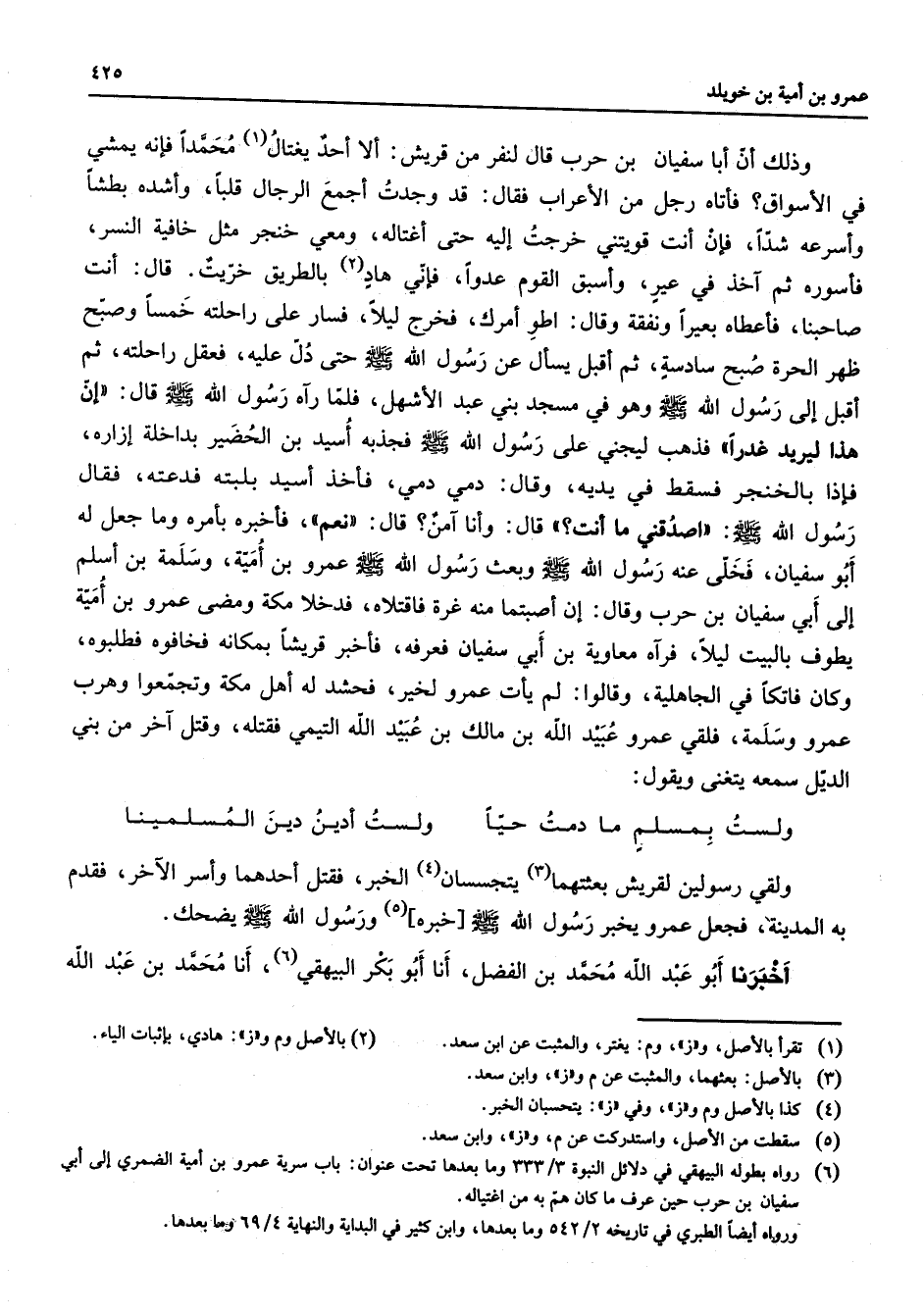 (6) رواه بطوله البيهقي في دلائل النبوة 3 / 333 وما بعدها تحت عنوان: باب سرية عمرو بن أمية الضمري إلى أبي سفيان بن حرب حين عرف ما كان هم به من اغتياله