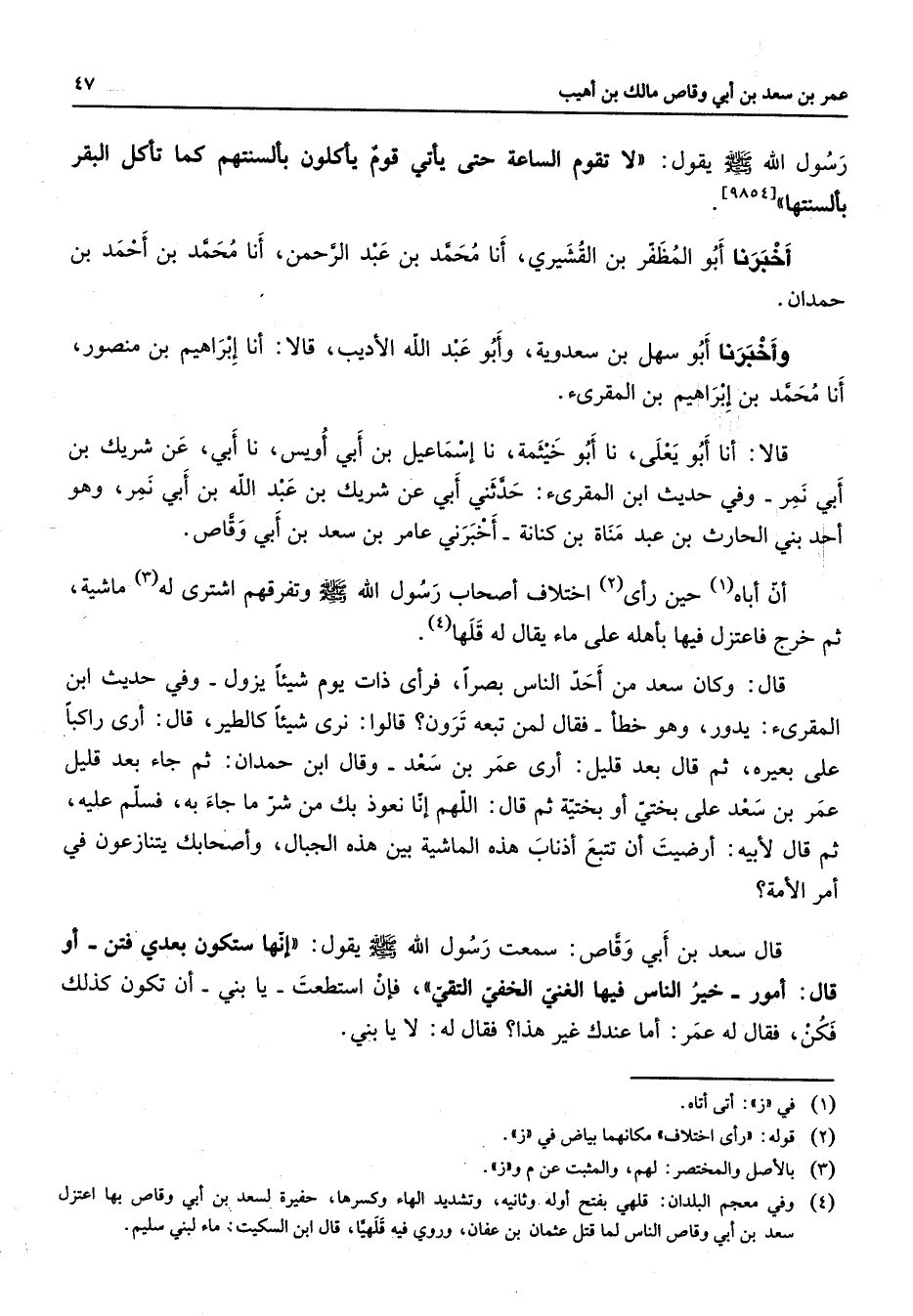 رسول الله (صلى الله عليه وسلم) يقول لا تقوم الساعة حتى يأتي قوم يأكلون بألسنتهم كما تأكل البقر بألسنتها أخبرنا أبو المظفر بن القشيري أنا محمد بن عبد الرحمن أنا محمد بن أحمد بن حمدان وأخبرنا أبو سهل بن سعدوية وأبو عبد الله الأديب قالا أنا إبراهيم بن منصور أنا محمد بن إبراهيم بن المقرئ قالا أنا أبو يعلى نا أبو خيثمة نا إسماعيل بن أبي أويس نا أبي عن شريك بن أبي نمر وفي حديث ابن المقرئ حدثني أبي عن شريك بن عبد الله بن أبي نمر وهو أحد بني الحارث بن عبد مناة بن كنانة أخبرني عامر بن سعد بن أبي وقاص أن أباه (1) حين رأى (2) اختلاف أصحاب رسول الله (صلى الله عليه وسلم) وتفرقهم اشترى له (3) ماشية ثم خرج فاعتزل فيها بأهله على ماء يقال له قلها (4) قال وكان سعد من أحد الناس بصرا فرأى ذات يوم شيئا يزول وفي حديث ابن المقرئ يدور وهو خطأ فقال لمن تبعه ترون قالوا نرى شيئا كالطير قال أرى راكبا على بعيره ثم قال بعد قليل أرى عمر بن سعد وقال ابن حمدان ثم جاء بعد قليل عمر بن سعد على بختي أو بختية ثم قال اللهم إنا نعوذ بك من شر ما جاء به فسلم عليه ثم قال لأبيه أرضيت أن تتبع أذناب هذه الماشية بين هذه الجبال وأصحابك يتنازعون في أمر الأمة قال سعد بن أبي وقاص سمعت رسول الله (صلى الله عليه وسلم) يقول إنها ستكون بعدي فتن أو قال أمور خير الناس فيها الغني الخفي التقي فإن استطعت يا بني أن تكون كذلك فكن فقال له عمر أما عندك غير هذا فقال له لا يا بني