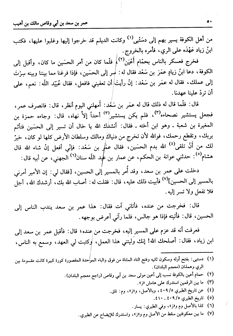 من أهل الكوفة يسير بهم إلى دستبى (1) وكانت الديلم قد خرجوا إليها وغلبوا عليها فكتب ابن زياد عهد على الري فأمره بالخروج فخرج فعسكر بالناس بحمام أعين (2) فلما كان من أمر الحسين ما كان وأقبل إلى الكوفة دعا ابن زياد عمر بن سعد فقال له سر إلى الحسين فإذا فرغنا مما بيننا وبينه سرت إلى عملك فقال له عمر بن سعد إن رأيت أن تعفيني فافعل فقال عبيد الله نعم على أن ترد علينا عهدنا قال فلما قال له ذلك قال له عمر بن سعد أمهلني اليوم أنظر قال فانصرف عمر فجعل يستشير نصحاءه (3) فلم يكن يستشير (3) أحدا إلا نهاه قال وجاءه حمزة بن المغيرة بن شعبة وهو ابن أخته فقال أنشدك الله يا خال أن تسير إلى الحسين فتأثم بربك وتقطع رحمك فوالله لأن تخرج من دنياك ومالك وسلطان الأرض كلها لو كان خير لك من أن تلقى (4) الله بدم الحسين فقال عمر بن سعد فإني أفعل إن شاء الله قال هشام (5) حدثني عوانة بن الحكم عن عمار بن عبد الله سنان (6) الجهني عن أبيه قال دخلت على عمر بن سعد وقد أمر بالمسير إلى الحسين فقال لي إن الأمير أمرني بالمسير إلى الحسين (7) فأبيت ذلك عليه قال فقلت له أصاب الله بك أرشدك الله أجل فلا تفعل ولا تسر إليه قال فخرجت من عنده فأتاني آت فقال هذا عمر بن سعد يندب الناس إلى الحسين قال فأتيته فإذا هو جالس فلما رآني أعرض بوجهه فعرفت أنه قد عزم على المسير إليه فخرجت من عنده قال فأقبل عمر بن سعد إلى ابن زياد فقال أصلحك الله إنك وليتني هذا العمل وكتبت لي العهد وسمع به الناس