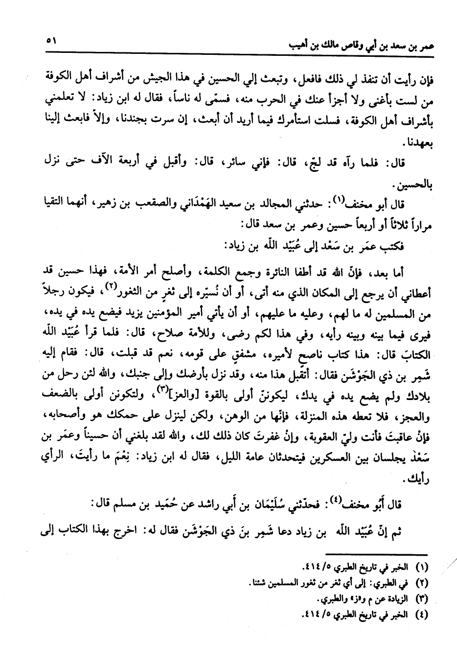 فإن رأيت أن تنفذ لي ذلك فافعل وتبعث إلي الحسين في هذا الجيش من أشراف أهل الكوفة من لست بأغنى ولا أجزأ عنك في الحرب منه فسمى له ناسا فقال له ابن زياد لا تعلمني بأشراف أهل الكوفة فسلت استأمرك فيما أريد أن أبعث إن سرت بجندنا وإلا فابعث إلينا بعهدنا قال فلما رأه قد لج قال فإني سائر قال وأقبل في أربعة الآف حتى نزل بالحسين قال أبو مخنف (1) حدثني المجالد بن سعيد الهمداني والصقعب بن زهير أنهما التقيا مرارا ثلاثا أو أربعا حسين وعمر بن سعد قال فكتب عمر بن سعد إلى عبيد الله بن زياد أما بعد فإن الله قد أطفا النائرة وجمع الكلمة وأصلح أمر الأمة فهذا حسين قد أعطاني أن يرجع إلى المكان الذي منه أتى أو أن نسيره إلى ثغر من الثغور (2) فيكون رجلا من المسلمين له ما لهم وعليه ما عليهم أو أن يأتي أمير المؤمنين يزيد فيضع يده في يده فيرى فيما بينه وبينه رأيه وفي هذا لكم رضى وللأمة صلاح قال فلما قرأ عبيد الله الكتاب قال هذا كتاب ناصح لأميره مشفق على قومه نعم قد قبلت قال فقام إليه شمر بن ذي الجوشن فقال أتقبل هذا منه وقد نزل بأرضك وإلى جنبك والله لئن رحل من بلادك ولم يضع يده في يدك ليكونن أولى بالقوة والعز ولتكونن أولى بالضعف والعجز فلا تعطه هذه المنزلة فإنها من الوهن ولكن لينزل على حمكك هو وأصحابه فإن عاقبت فأنة ولي العقوبة وإن غفرت كان ذلك لك والله لقد بلغني أن حسينا وعمر بن سعد يجلسان بين العسكرين فيتحدثان عامة الليل فقال له ابن زياد نعم ما رأيت الرأي رأيك قال أبو مخنف (4) فحدثني سليمان بن أبي راشد عن حميد بن مسلم قال ثم إن عبيد الله بن زياد دعا شمر بن ذي الجوشن فقال له اخرج بهذ الكتاب إلى