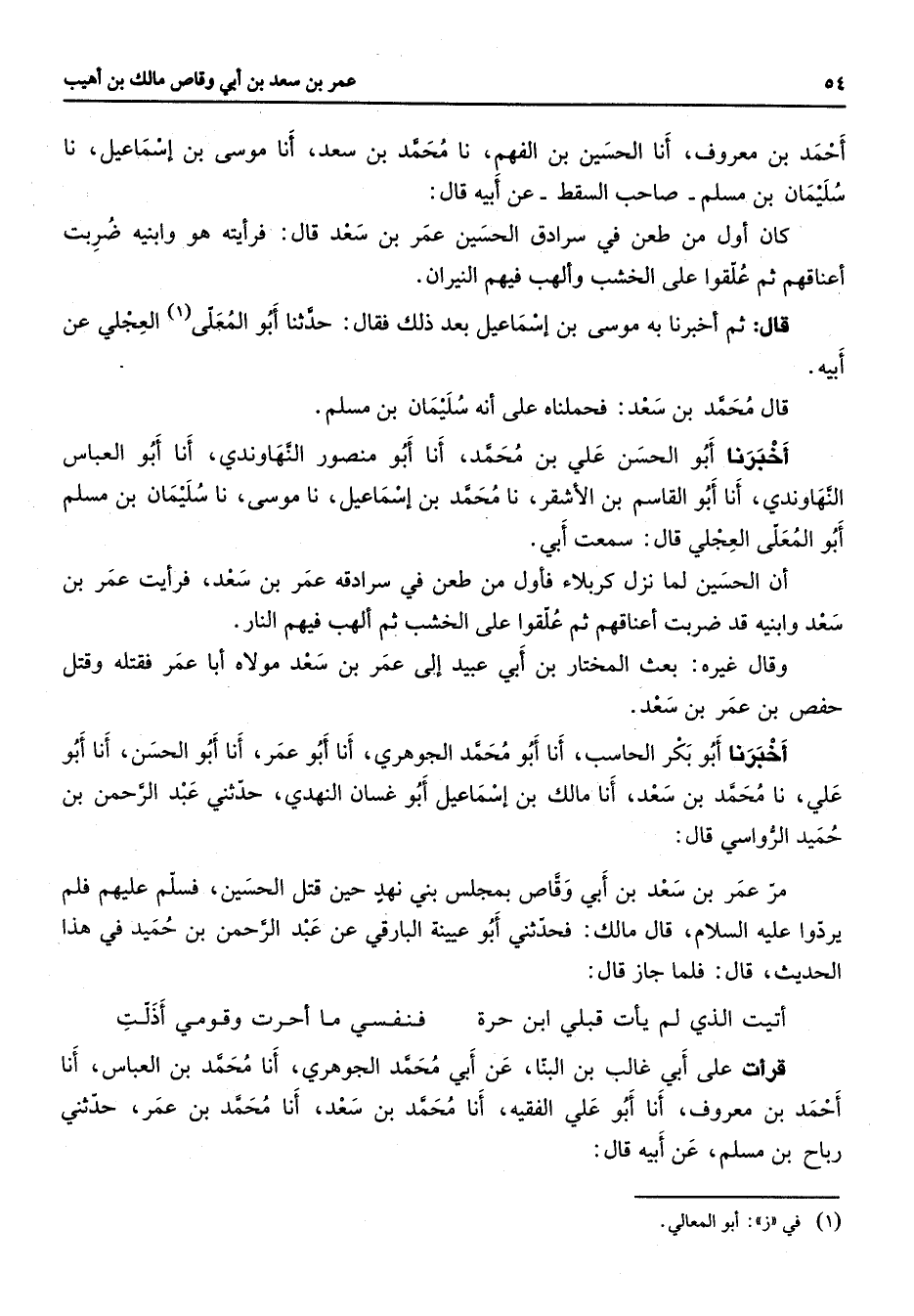 أحمد بن معروف أنا الحسين بن الفهم نا محمد بن سعد أنا موسى بن إسماعيل نا سليمان بن مسلم صاحب السقط عن أبيه قال كان أول من طعن في سرادق الحسين عمربن سعد قال فرأيته هو وابنيه ضربت أعناقهم ثم علقوا على الخشب وألهب فيهم النيران قال ثم أخبرنا به موسى بن إسماعيل بعد ذلك فقال حدثنا أبو المعلى العجلي عن أبيه قال محمد بن سعد فحملناه على أنه سليمان بن مسلم أخبرنا أبو الحسن علي بن محمد أنا أبو منصور النهاوندي أنا أبو العباس النهاوندي أنا أبو القاسم بن الأشقر نا محمد بن إسماعيل نا موسى نا سليمان بن مسلم أبو المعلى العجلي قال سمعت أبي أن الحسين لما نزل كربلاء فأول من طعن في سرادقه عمر بن سعد فرأيت عمر بن سعد وابنيه قد ضربت أعناقهم ثم علقوا على الخشب ثم ألهب فيهم النار وقال غيره بعث المختار بن أبي عبيد إلى عمر بن سعد مولاه أبا عمر فقتله وقتل حفص بن عمر بن سعد أخبرنا أبو بكر الحاسب أنا أبو محمد الجوهري أنا أبو عمر أنا أبو الحسن أنا أبو علي نا محمد بن سعد أنا مالك بن إسماعيل أبو غسان النهدي حدثني عبد الرحمن بن حميد الرواسي قال مر عمر بن سعد بن أبي وقاص بمجلس بني نهد حين قتل الحسين فسلم عليهم فلم يردوا عليه السلام قال مالك فحدثني أبو عيينة البارقي عن عبد الرحمن بن حميد في هذا الحديث قال فلما جاز قال * أتيت الذي لم يأت قبلي ابن حرة * فنفسي ما أحرت وقومي أذلت * قرأت على أبي غالب بن البنا عن أبي محمد الجوهري أنا محمد بن العباس أنا أحمد بن معروف أنا أبو علي الفقيه أنا محمد بن سعد أنا محمد بن عمر حدثني رباح بن مسلم عن أبيه قال