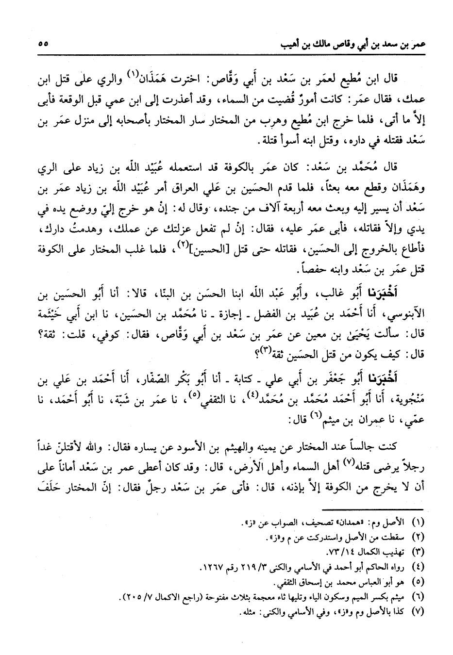 قال ابن مطيع لعمر بن سعد بن أبي وقاص اخترت همذان (1) والري على قتل ابن عمك فقال عمر كانت أمور قضيت من السماء وقد أعذرت إلى ابن عمي قبل الوقعة فأبى إلا ما أتى فلما خرج ابن مطيع وهرب من المختار سار المختار بأصحاب إلى منزل عمر بن سعد فقتله في داره وقتل ابنه أسوأ قتلة قال محمد بن سعد كان عمر بالكوفة قد استعمله عبيد الله بن زياد على الري وهمذان وقطع معه بعثا فلما قدم الحسين بن علي العراق أمر عبيد الله بن زياد عمر بن سعد أن يسير إليه وبعث معه أربعة آلاف من جنده وقال له إن هو خرج إلي ووضع يده في يدي وإلا فقاتله فأبى عمر عليه فقال إن لم تفعل عزلتك عن عملك وهدمت دارك فأطاع بالخروج إلى الحسين فقاتله حتى قتل الحسين (2) فلما غلب المختار على الكوفة قتل عمر بن سعد وابنه حفصا أخبرنا أبو غالب وأبو عبد الله ابنا الحسن بن البنا قالا أنا أبو الحسين بن الآبنوسي أنا أحمد بن عبيد بن الفضل إجازة نا محمد بن الحسين نا ابن أبي خيثمة قال سألت يحيى بن معين عن عمر بن سعد بن أبي وقاص فقال كوفي قلت ثقة قال كيف يكون من قتل الحسين ثقة (3) أخبرنا أبو جعفر بن أبي علي كتابة أنا أبو بكر الصفار أنا أحمد بن علي بن منجوية أنا أبو أحمد محمد بن محمد (4) نا الثقفنا (4) عمر بن شبة نا أبو أحمد نا عمي نا عمران بن ميثم (6) قال كنت جالسا عند المختار عن يمينه والهيثم بن الأسود عن يساره فقال والله لأقتلن غدا رجلا يرضى قتله (7) أهل السماء وأهل الأرض قال وقد كان أعطى عمر بن سعد أمانا على أن لا يخرمن الكوفة إلا بإذنه قال فأتى عمر بن سعد رجل فقال إن المختار حلف