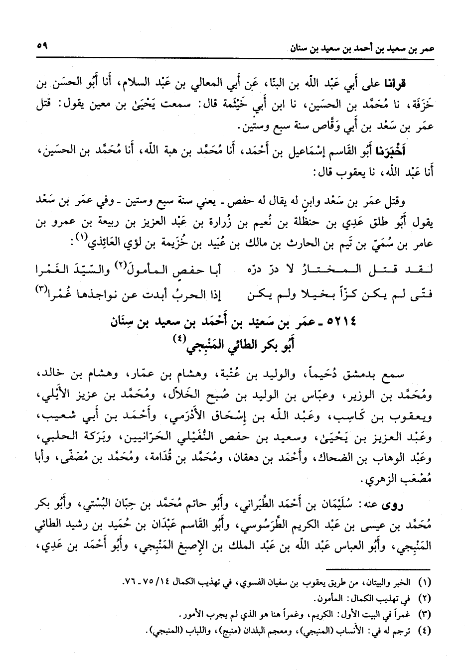 5214 - عمر بن سعيد بن أحمد بن سعيد بن سنان أبو بكر الطائي المنبجي (4) سمع بدمشق دحيما والوليد بن عتبة وهشام بن عمار وهشام بن خالد ومحمد بن الوزير وعباس بن الوليد بن صبح الخلال ومحمد بن عزيز الأيلي ويعقوب بن كاسب وعبد الله بن إسحاق الأدرمي وأحمد بن أبي شعيب وعبد العزيز بن يحيى وسعيد بن حفص النفيلي الحرانيين وبركة الحلبي وعبد الوهاب بن الضحاك وأحمد بن دهقان ومحمد بن قدامة ومحمد بن مصفى وأبا مصعب الزهري روى عنه سليمان بن أحمد الطبراني وأبو حاتم محمد بن حبان البستي وأبو بكر محمد بن عيسى بن عبد الكريم الطرسوسي وأبو القاسم عبدان بن حميد بن رشيد الطائي المنبجي وأبو العباس عبد الله بن عبد الملك بن الإصبغ المنبجي وأبو أحمد بن عدي