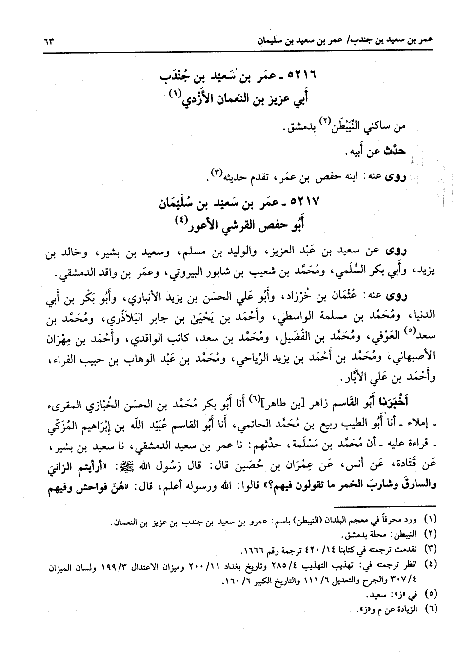 5216 - عمر بن سعيد بن جندب أبي عزيز بن النعمان الأزدي (1) من ساكني النيبطن (2) بدمشق حدث عن أبيه روى عنه ابنه حفص بن عمر تقدم حديثه (3)