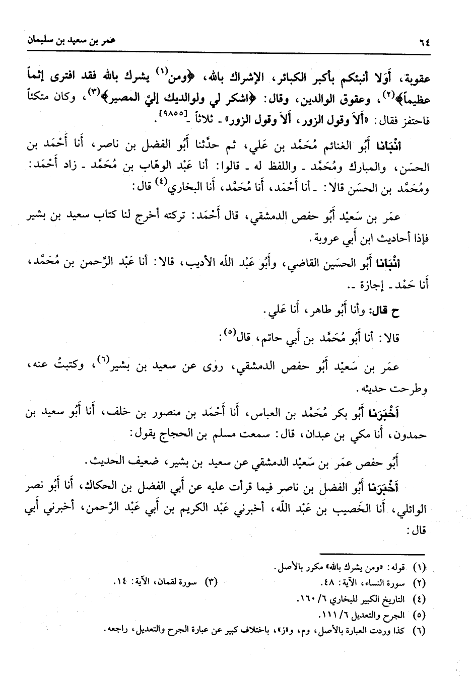 عقوبة أولا أنبئكم بأكبر الكبائر الإشراك بالله " ومن (1) يشرك بالله فقد افترى إثما عظيما " (2) وعقوق الوالدين وقال " اشكر لي ولوالديك إلي المصير " وكان متكئا فاحتفز فقال ألا وقول الزور ألا وقول الزور ثلاثا أنبأنا أبو الغنائم محمد بن علي ثم حدثنا أبو الفضل بن ناصر أنا أحمد بن الحسن والمبارك ومحمد واللفظ له قالوا أنا عبد الوهاب بن محمد زاد أحمد ومحمد بن الحسن قالا أنا أحمد أنا محمد أنا البخاري (4) قال عمر بن سعيد أبو حفص الدمشقي قال أحمد تركته أخرج لنا كتاب سعيد بن بشير فإذا أحاديث ابن أبى عروبة أنبأنا أبو الحسين القاضي وأبو عبد الله الأديب قالا أنا عبد الرحمن بن محمد أنا حمد إجازة ح قال وأنا أبو طاهر أنا علي قالا أنا أبو محمد بن أبي حاتم قال (5) عمر بن سعيد أبو حفص الدمشقي روى عن سعيد بن بشير (6) وكتبت عنه وطرحت حديثه أخبرنا أبو بكر محمد بن العباس أنا أحمد بن منصور بن خلف أنا أبو سعيد بن حمدون أنا مكي بن عبدان قال سمعت مسلم بن الحجاج يقول أبو حفص عمر بن سعيد الدمشقي عن سعيد بن بشير ضعيف الحديث أخبرنا أبو الفضل بن ناصر فيما قرأت عليه عن أبي الفضل بن الحكاك أنا أبو نصر الوائلي أنا الخصيب بن عبد الله أخبرني عبد الكريم بن أبي عبد الرحمن أخبرني أبي قال